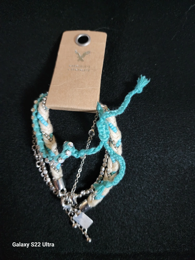 Selling a cute American Eagle bracelet set! It features a mix of silver chains, braided rope, and turquoise accents. Perfect for adding a little sparkle to your outfit!