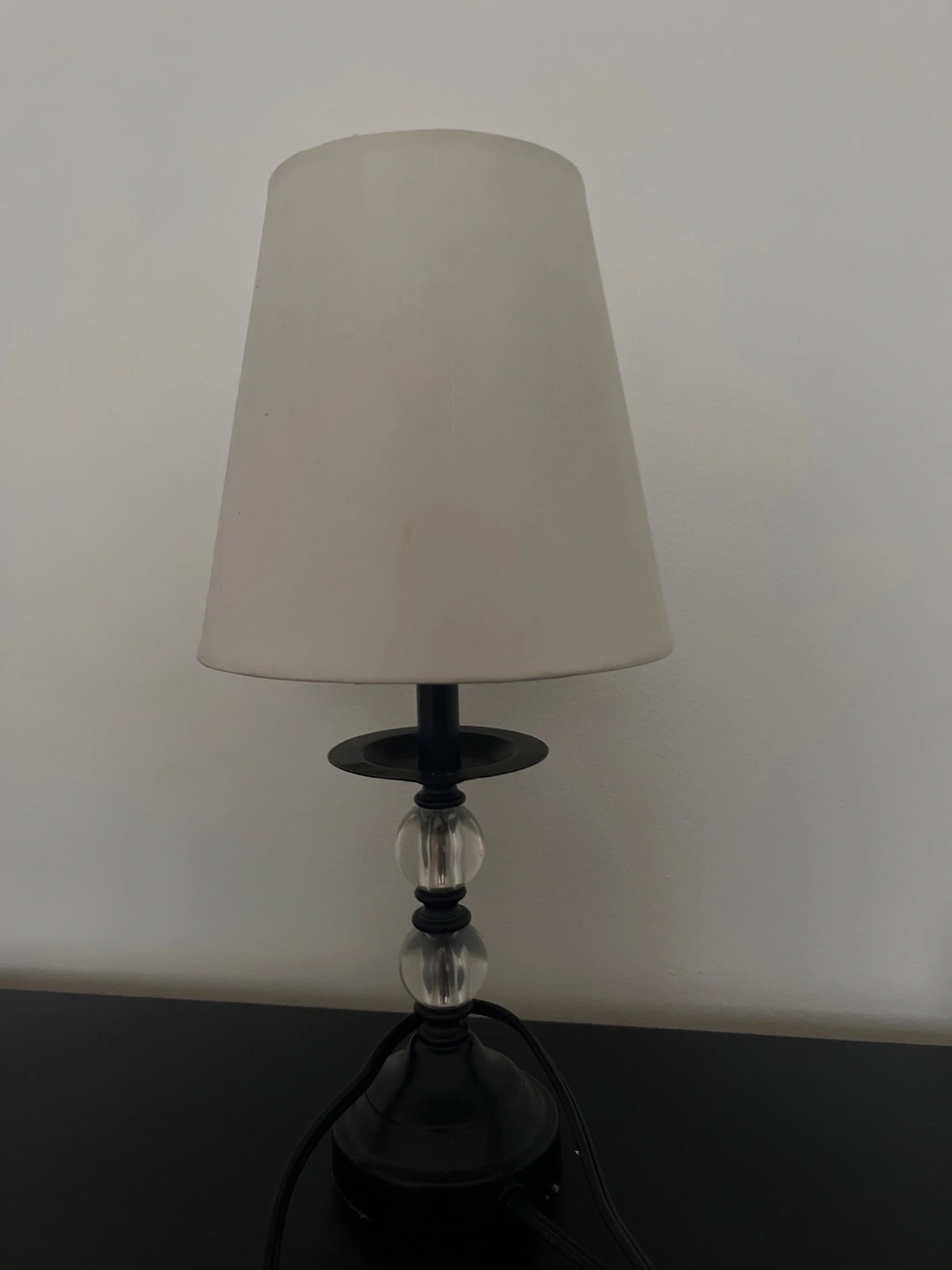 Selling a cute table lamp! It features a white lampshade and a black base with clear glass ball accents. It's in great condition and would look lovely in a bedroom or living room