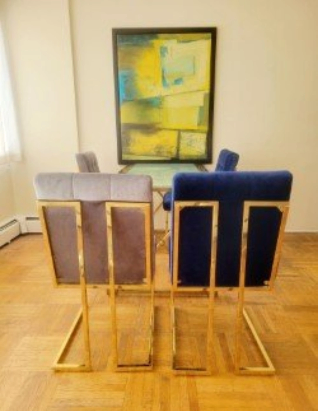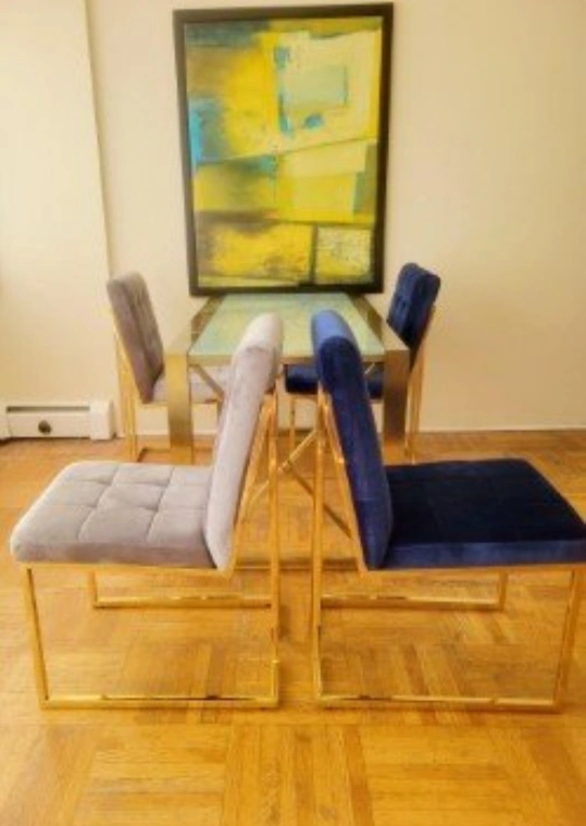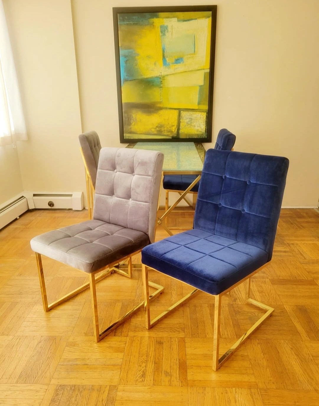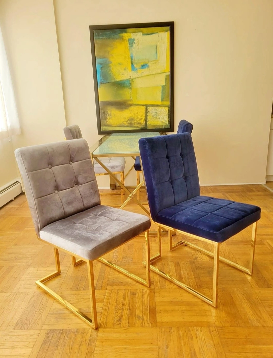 Brand New Grey And Blue Suede Dining Chairs With Gold Legs (Delivery Available) Modern chic dining chairs featuring a gold metal cantilever sled frame and tufted plush upholstery. Available in grey and blue - 6 grey, 2 blue Price: $115 per chair. Dimensions: 19"(w) × 23.5"(d) × 36"(h), the height of the seat is 19". Pick up in downtown Vancouver or delivery may be arranged for a reasonable fee. Tags: modern Contemporary chic glam luxury tufted metal chrome gold brass guild cb2 eq3 west elm pottery barn crate and barrel structube article urban barn moes Scandesign rove concept dining set bistro Cafe parlour westendtrends vanvaluevintage