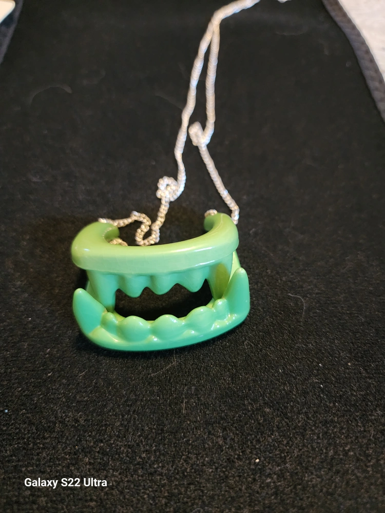 Here's a fun and quirky green vampire teeth necklace! It's a unique piece that's sure to get some attention. The necklace features a set of novelty vampire teeth in a bright green color, strung on a silver-tone chain. Perfect for adding a bit of playful spookiness to your outfit! ONE OF A KIND!