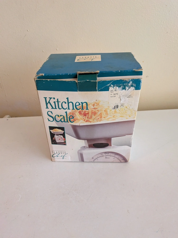 Classic Chef kitchen scale. It has an attractive countertop design and measures in both grams and ounces. It also has an easy and accurate adjustment. The top rack of the dishwasher is safe for the measuring tray. It has a 2.25 kgs/5 lbs capacity. The original box is included!