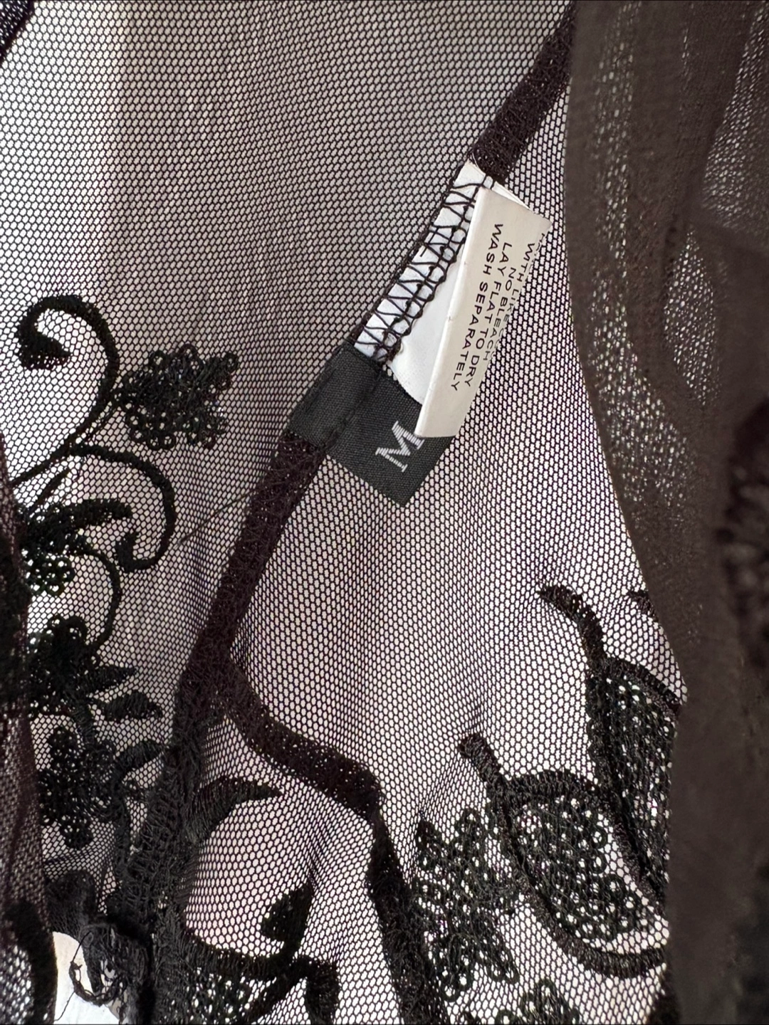 Selling a lovely black floral sequin lace bodysuit from Yaya & Co. It features a V-neck and long sleeves, perfect for a night out or a special occasion. The intricate floral design with sequins adds a touch of elegance to this piece