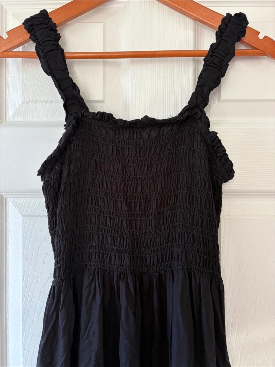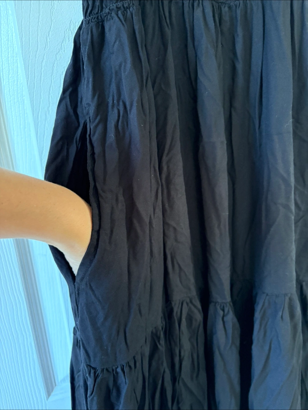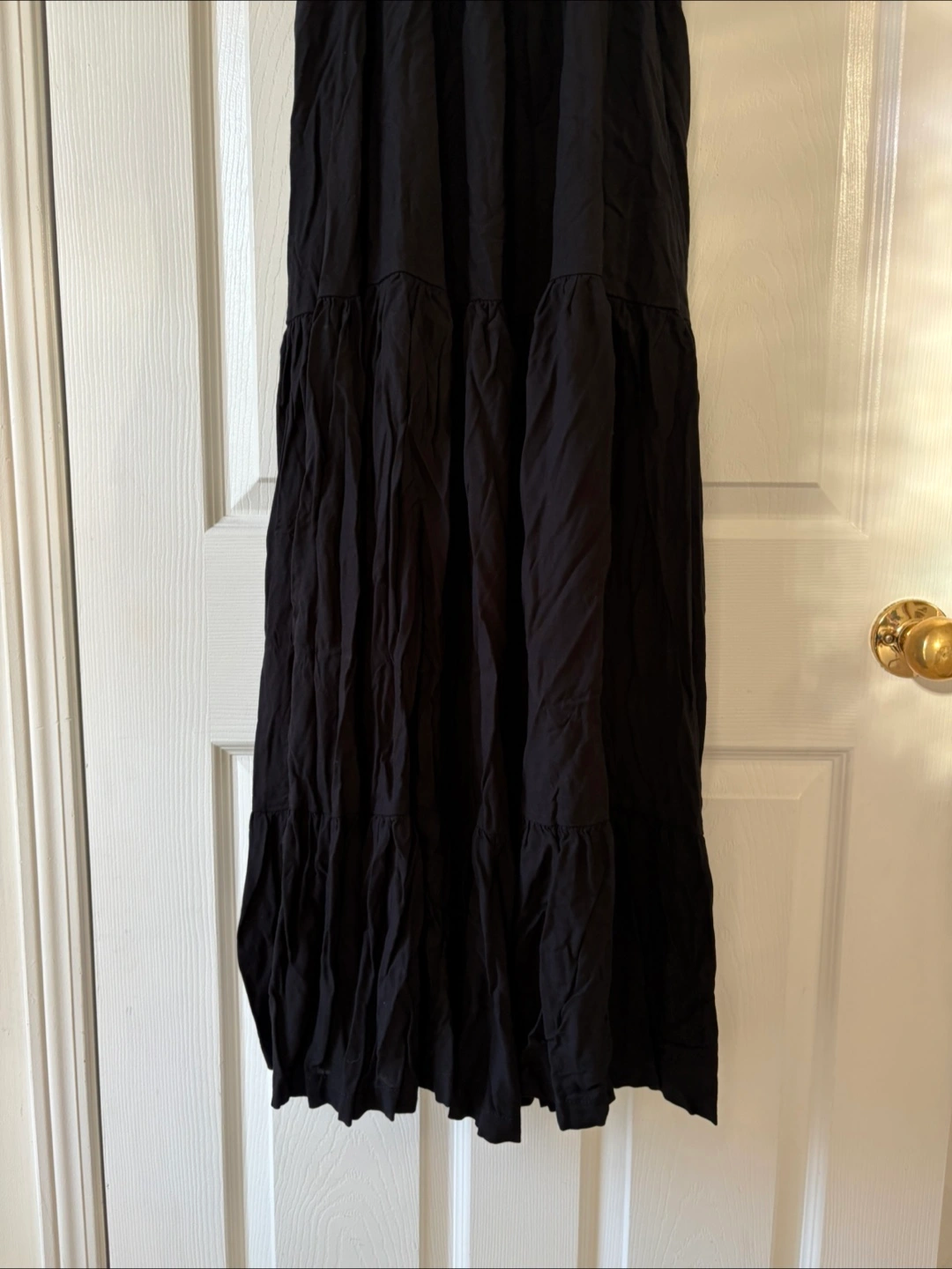 A lovely black maxi dress! It's made of a comfortable material and has a tiered design. Perfect for a casual day out or dressed up for an evening occasion