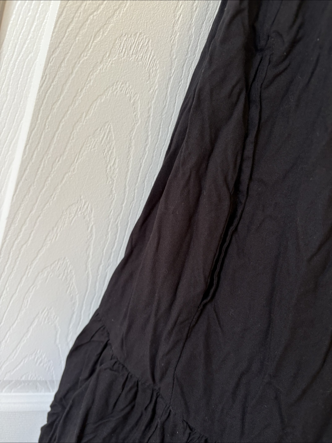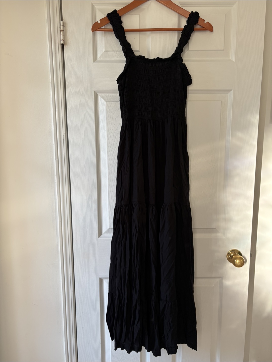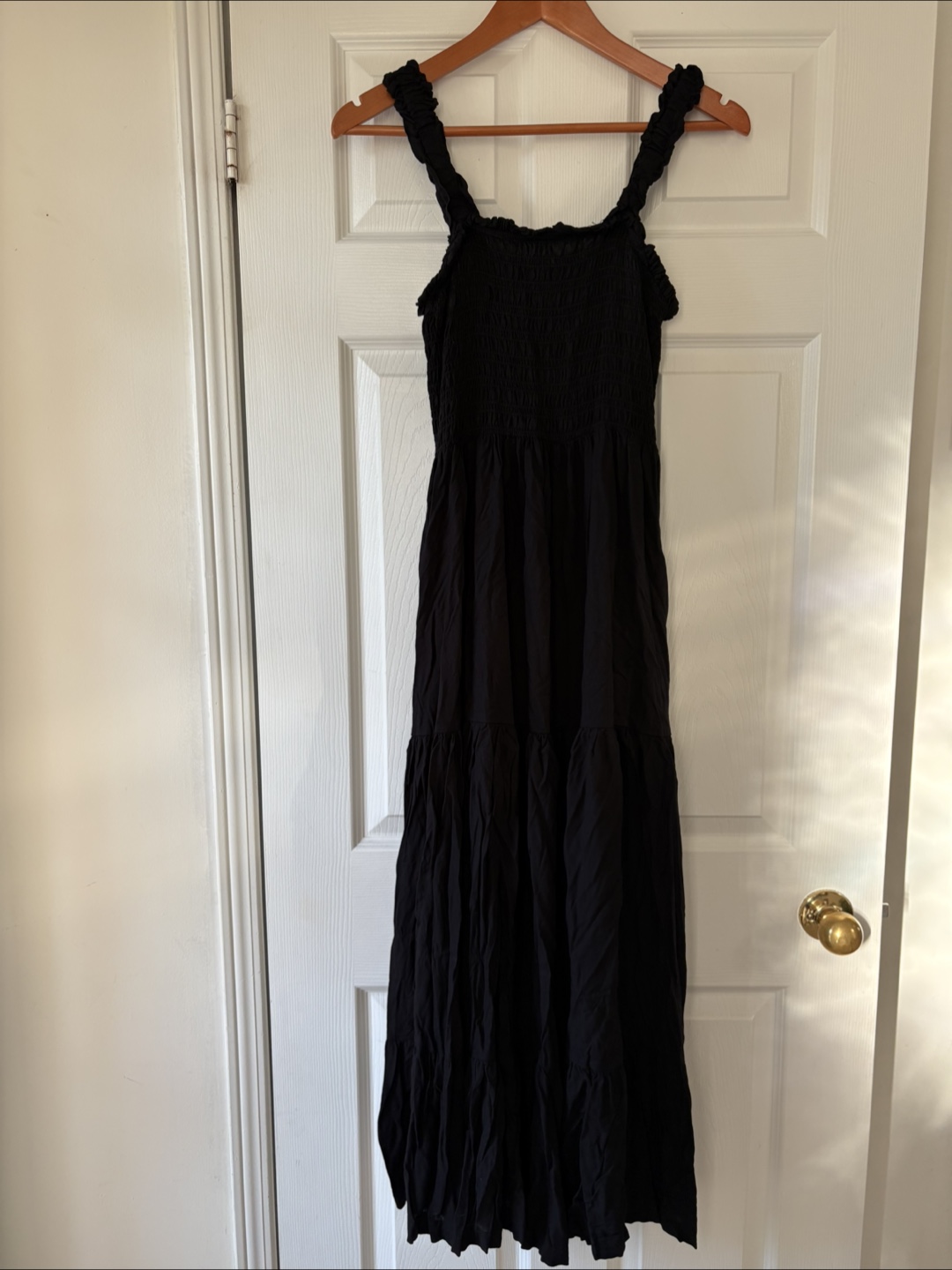 A lovely black maxi dress! It's made of a comfortable material and has a tiered design. Perfect for a casual day out or dressed up for an evening occasion
