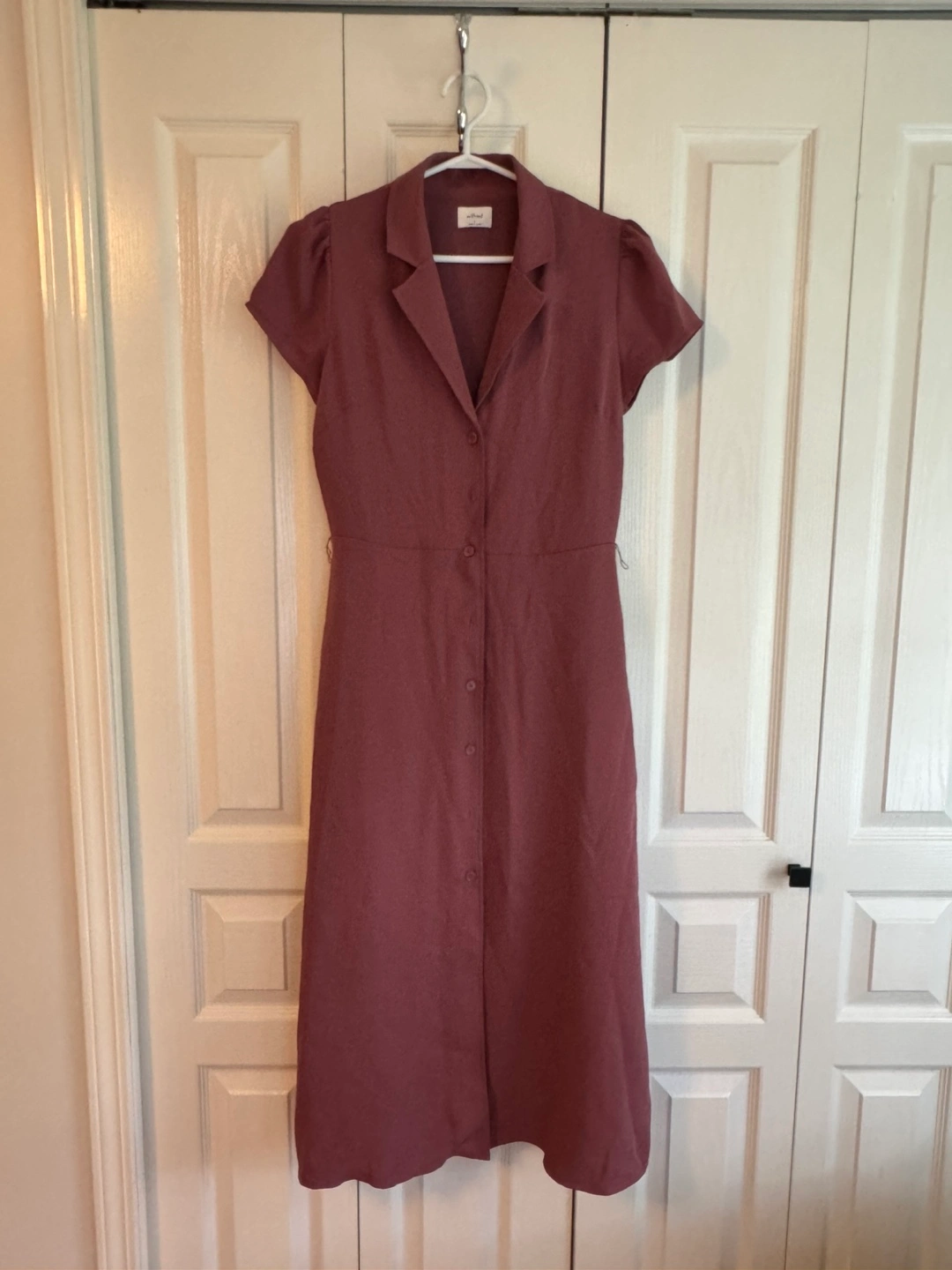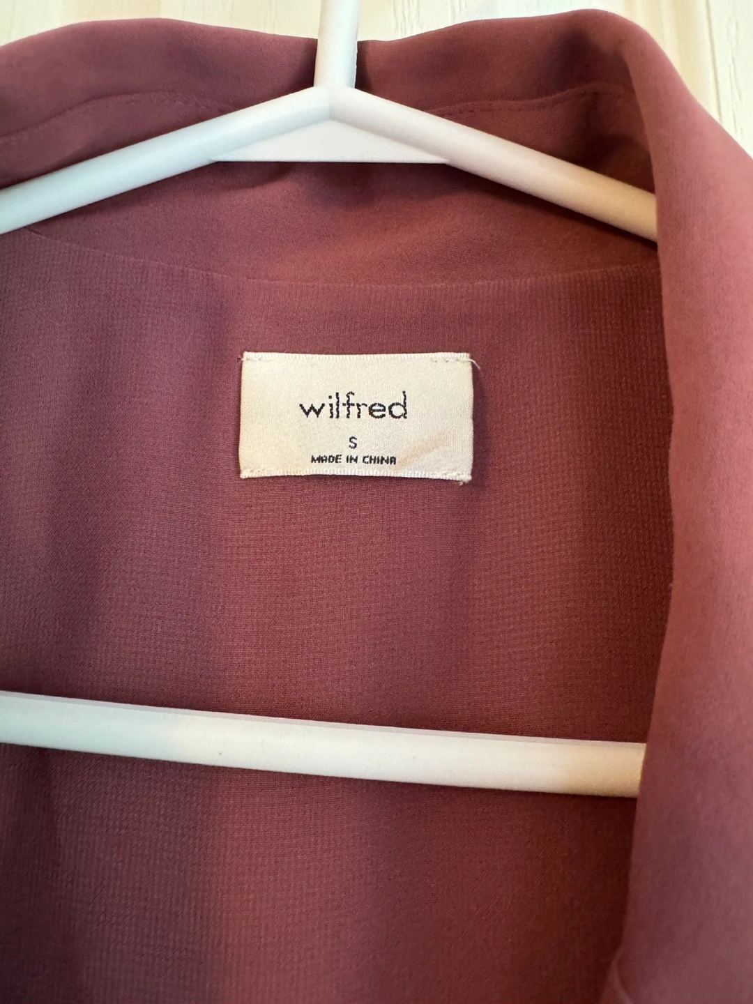 A cute Wilfred dress in size small. Brand new! Perfect for a casual day out or dressed up for an evening occasion. The colour is a lovely muted mauve, and the material is lightweight and comfortable!