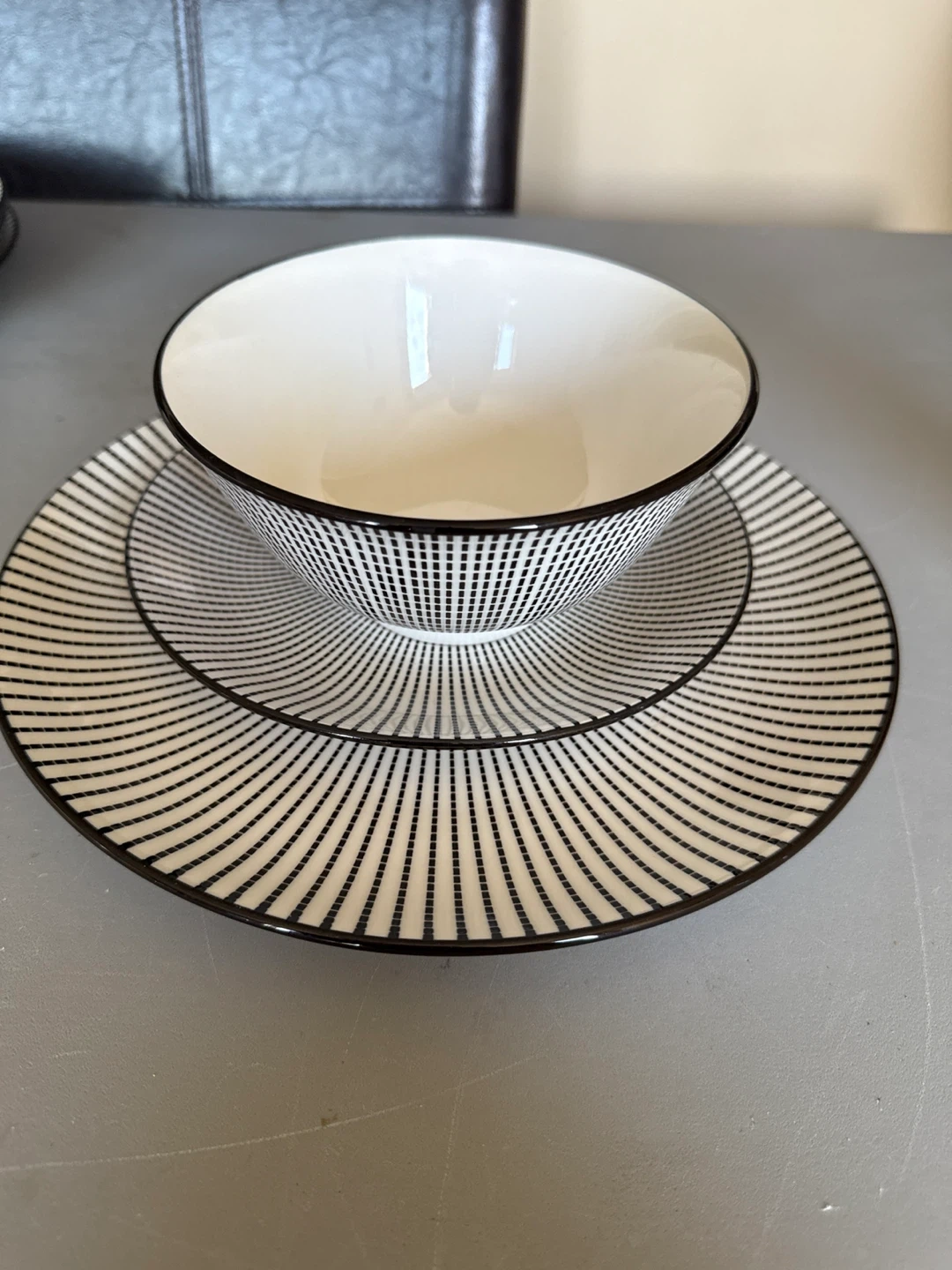 Selling a plate and bowl set with a cool striped design! They're in great shape and would look lovely in any kitchen. Perfect for everyday use or for adding a touch of style to your dining table.