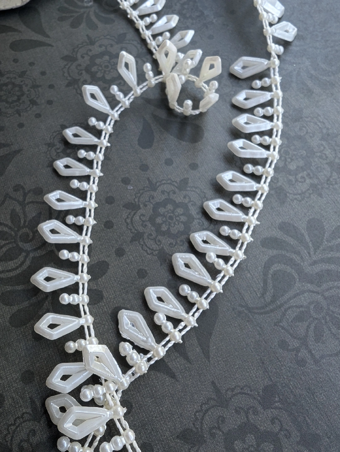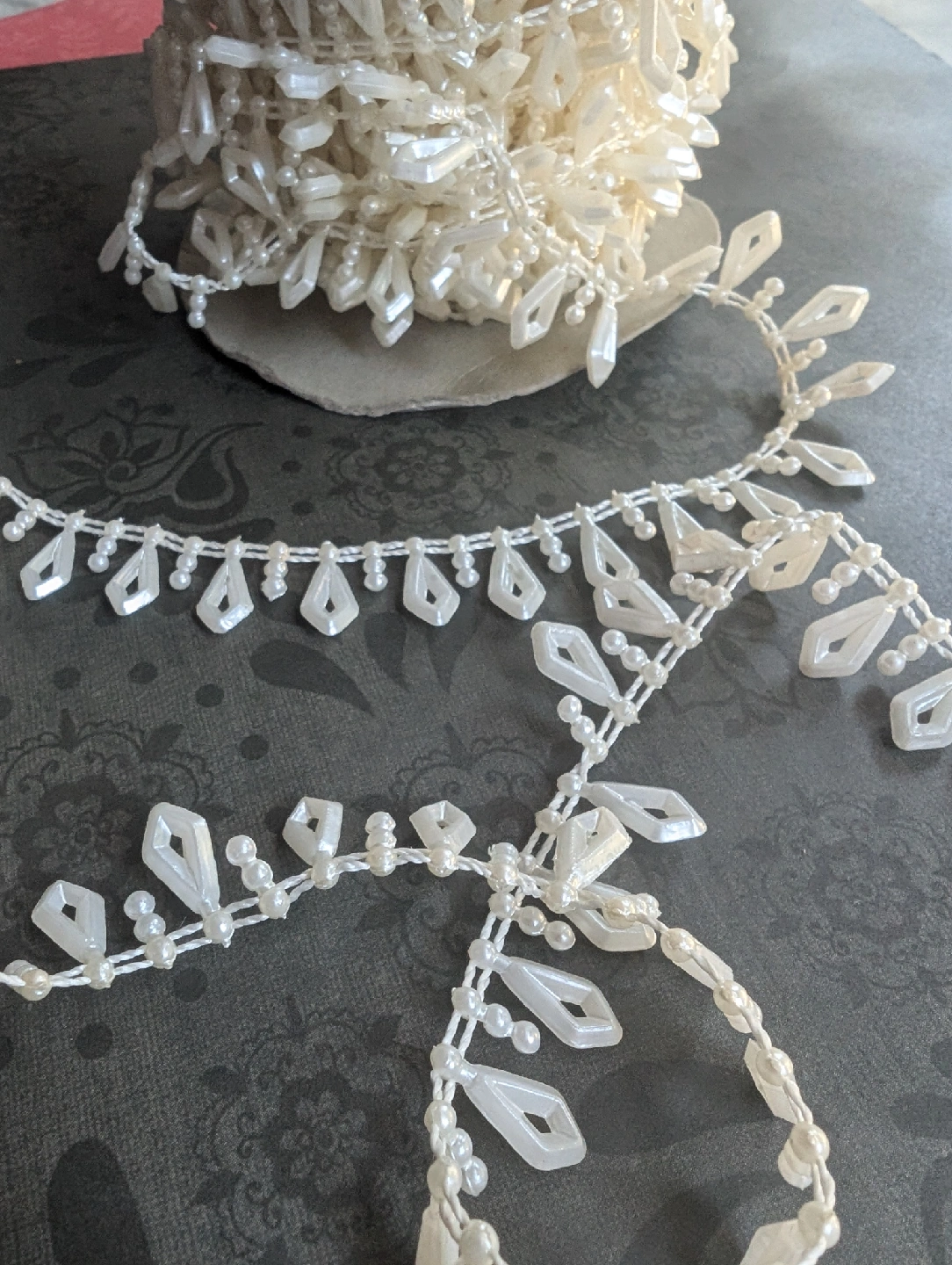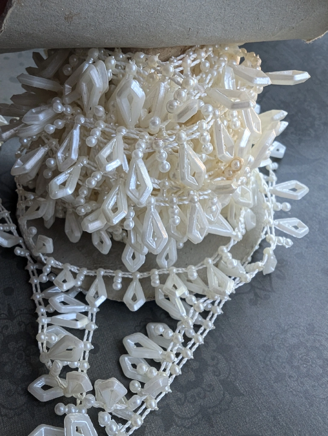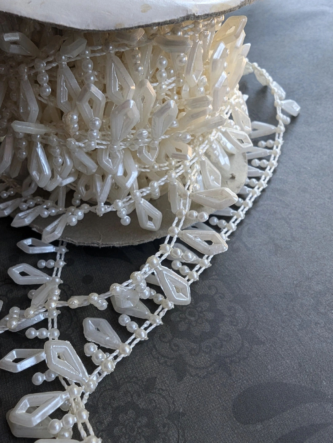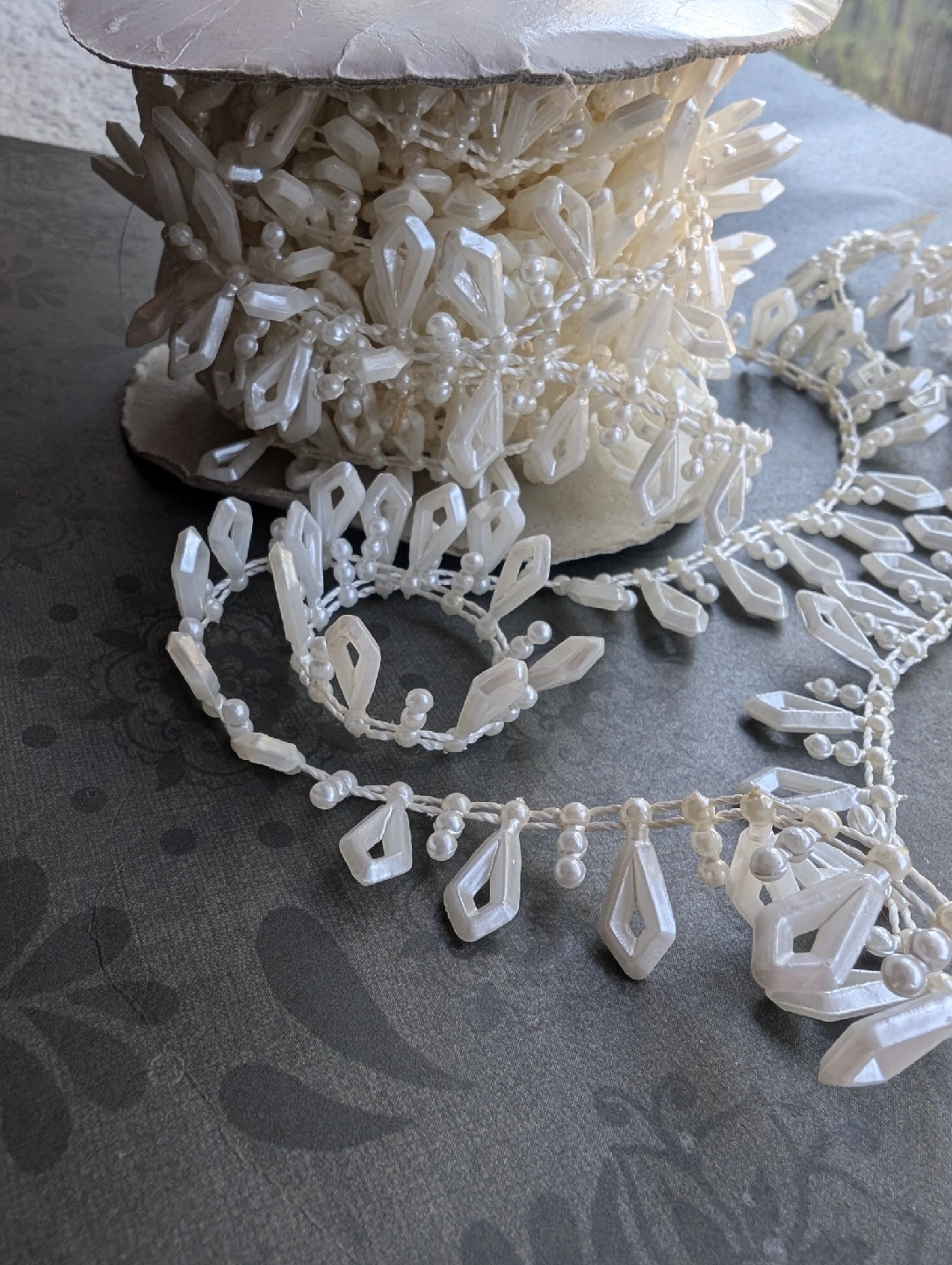 157This is a beautiful roll of beaded trim, perfect for adding a touch of elegance to your crafts or sewing projects! The trim features delicate white beads and diamond-shaped accents. It's in great condition and ready to be used for your next creative endeavour About 6 yards, 27 inches $6 firm Cash only, no etransfers Rathburn & Renforth