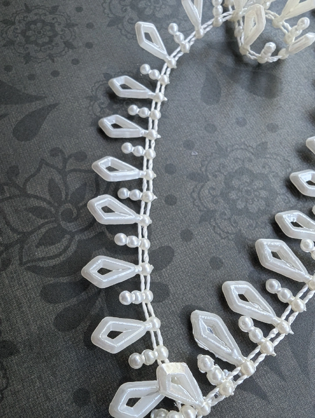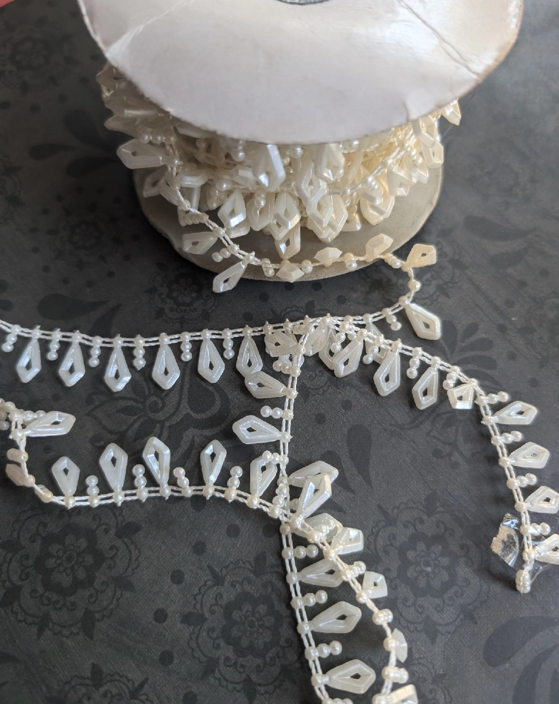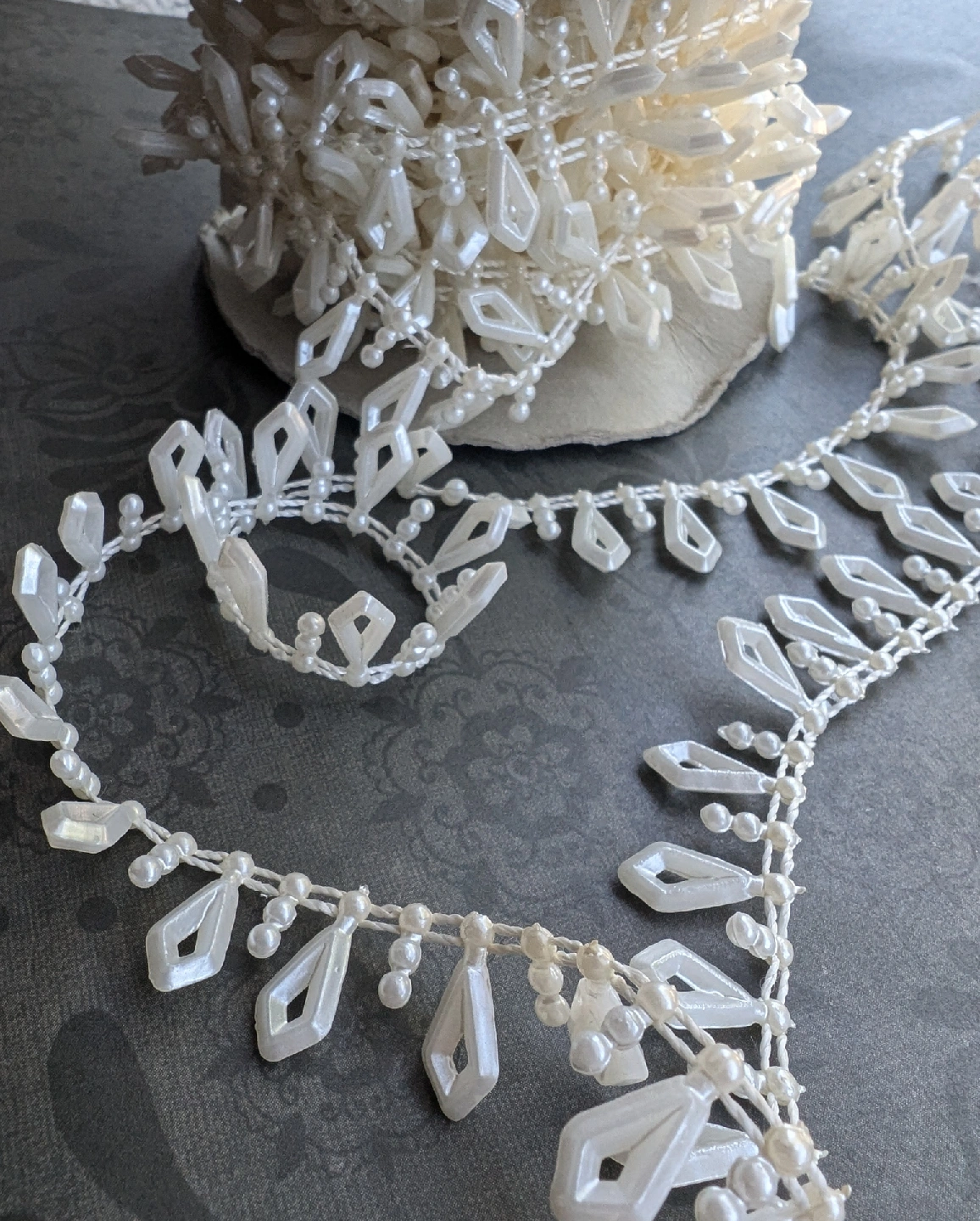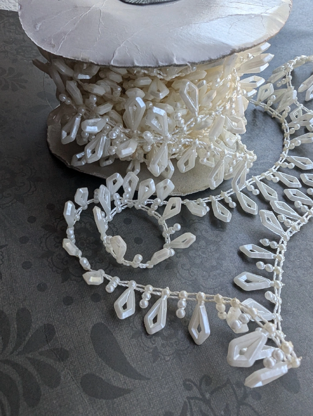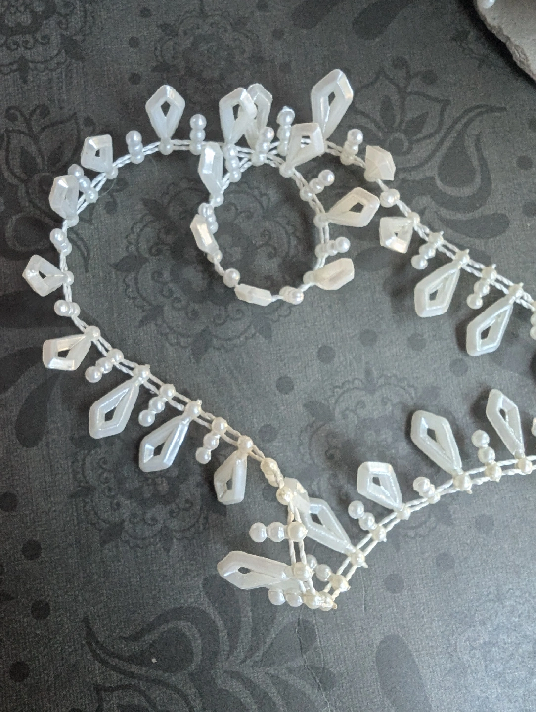 157This is a beautiful roll of beaded trim, perfect for adding a touch of elegance to your crafts or sewing projects! The trim features delicate white beads and diamond-shaped accents. It's in great condition and ready to be used for your next creative endeavour About 6 yards, 27 inches $6 firm Cash only, no etransfers Rathburn & Renforth