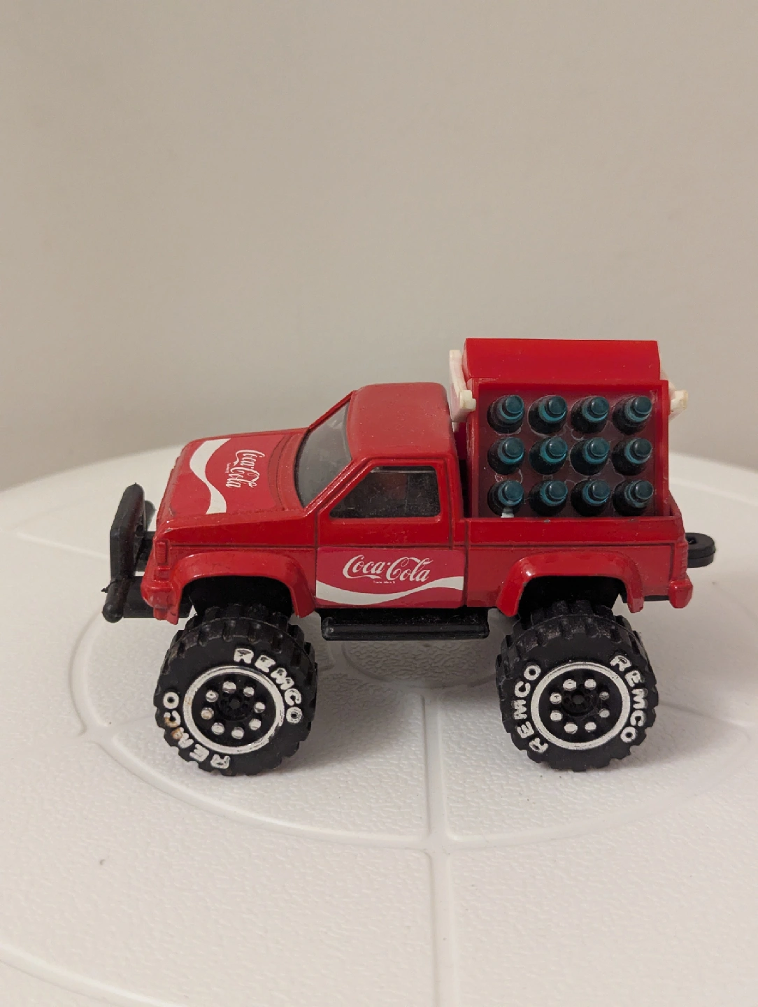 Selling a vintage 1987 Coca Cola REMCO toy truck! It's a fun collectible and in good condition for its age. The truck has Coca-Cola logos on the side and back. The tires are marked with REMCO. Both cases are present but one is missing the bottles. Made in 1987.