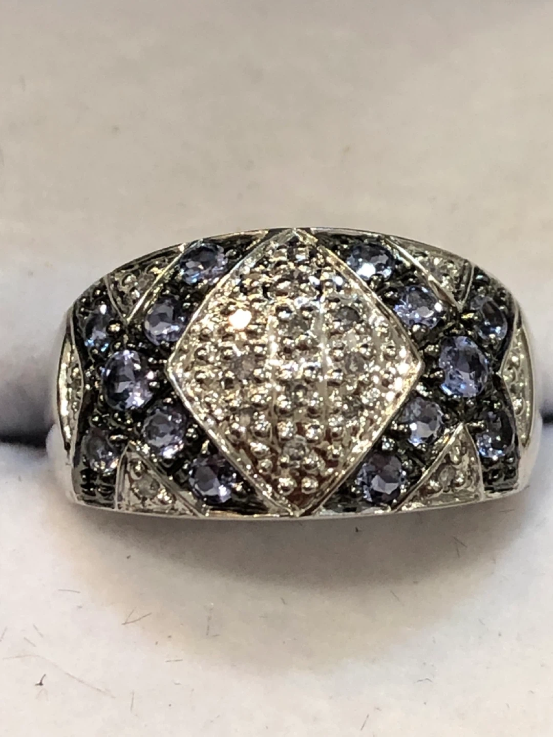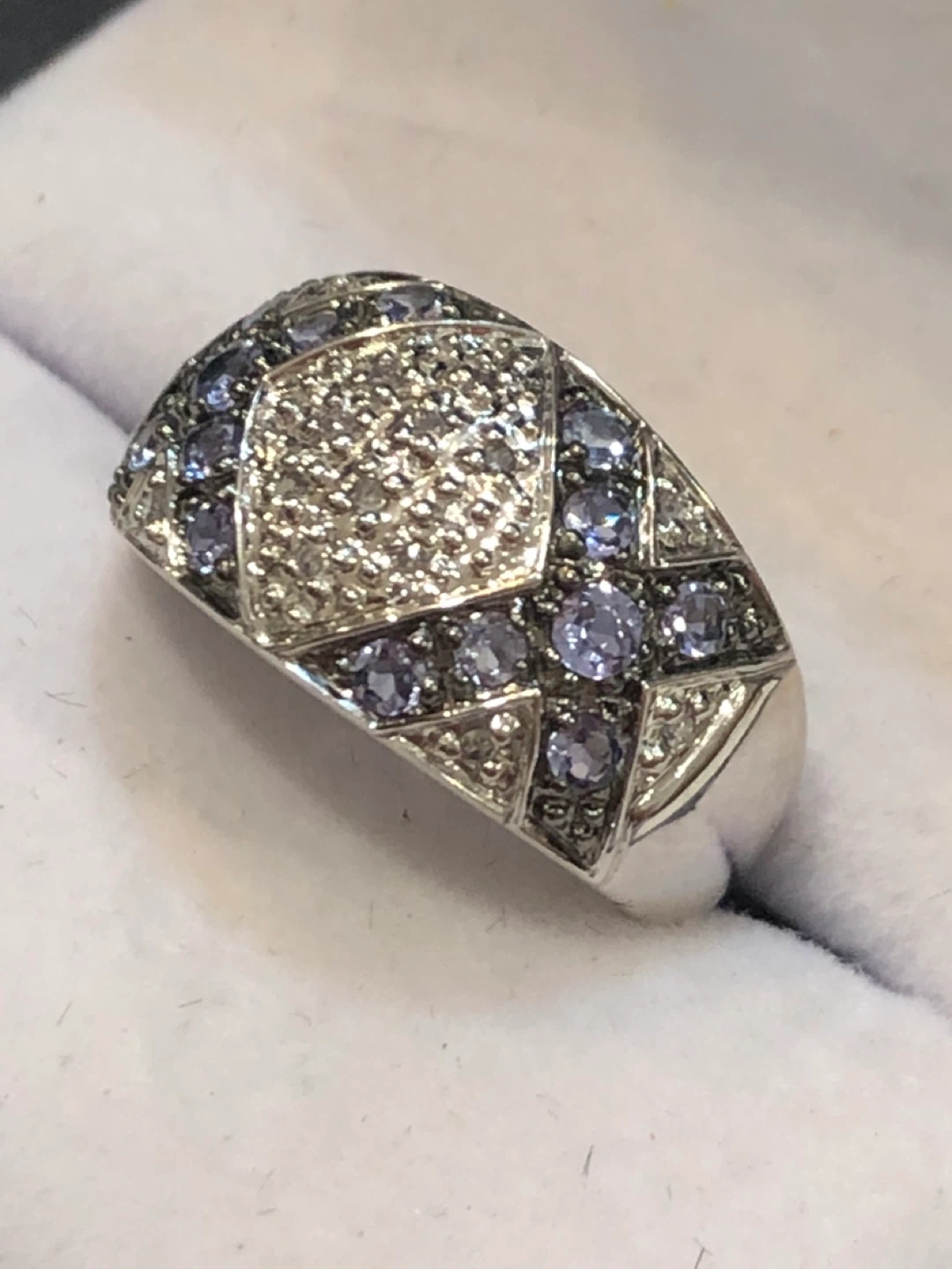 Beautiful ring featuring diamonds and tanzanite stones. 10k solid white gold .. It has a unique design and is in New condition. The ring weighs approximately 6.85 grams