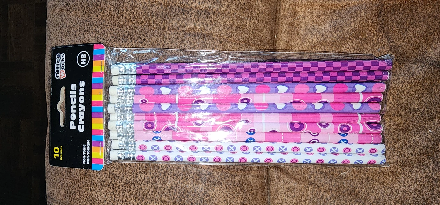 Selling a pack of Office Works pencils/crayons! This pack comes with 10 pencils, each with a fun and colourful design. They are non-toxic, so they're safe for kids to use.
