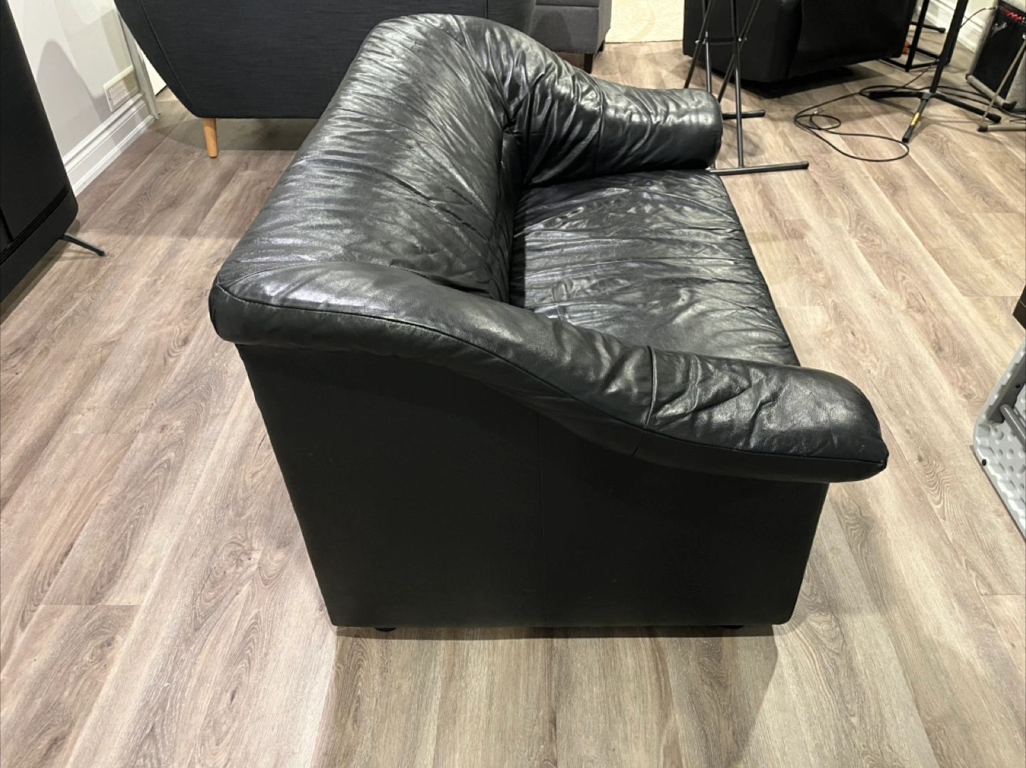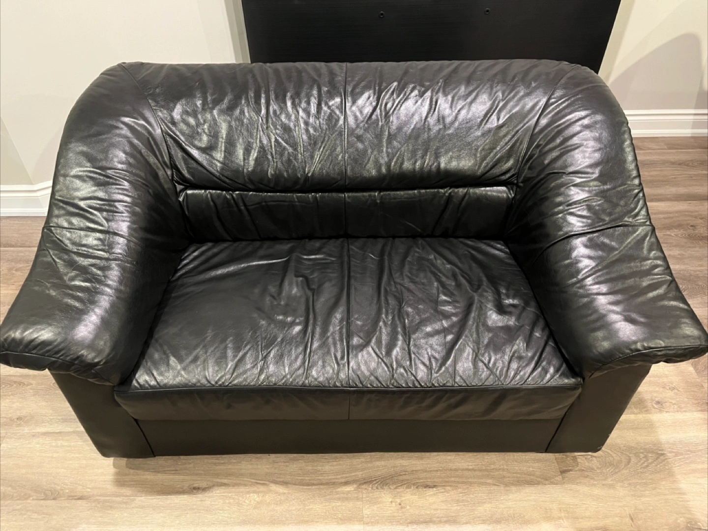 Selling a comfy black leather loveseat! It's in good used condition and would be a great addition to any living space or chill area.
