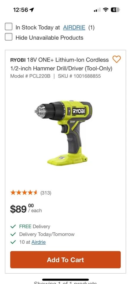 Buy & SellRyobi Hammer drillRyobi Hammer drill$50RYOBI 18V ONE+ Lithium-Ion Cordless 1/2-inch Hammer Drill/Driver (Tool-Only) Model # PCL220B. Brand new still an unopened box. Pick up in SW AirdrieWHERE TO MEETCheck LocationView MapSELLERverifiedDaleWindsong863 reviews0 chats·0 favorites·24 viewsSEND CHAT TO SELLERHi Dale! I’m interested in your listing.Hi Dale! I’m interested in your listing.Get the Karrot app to chatSign In to chat