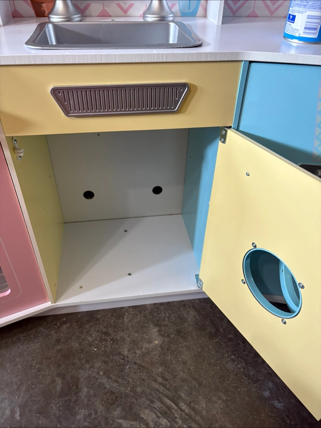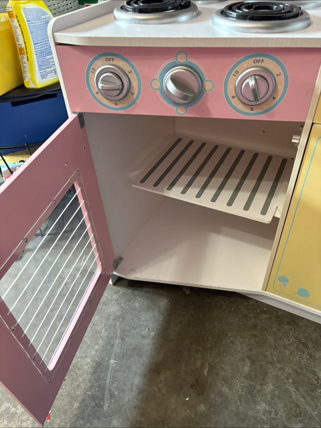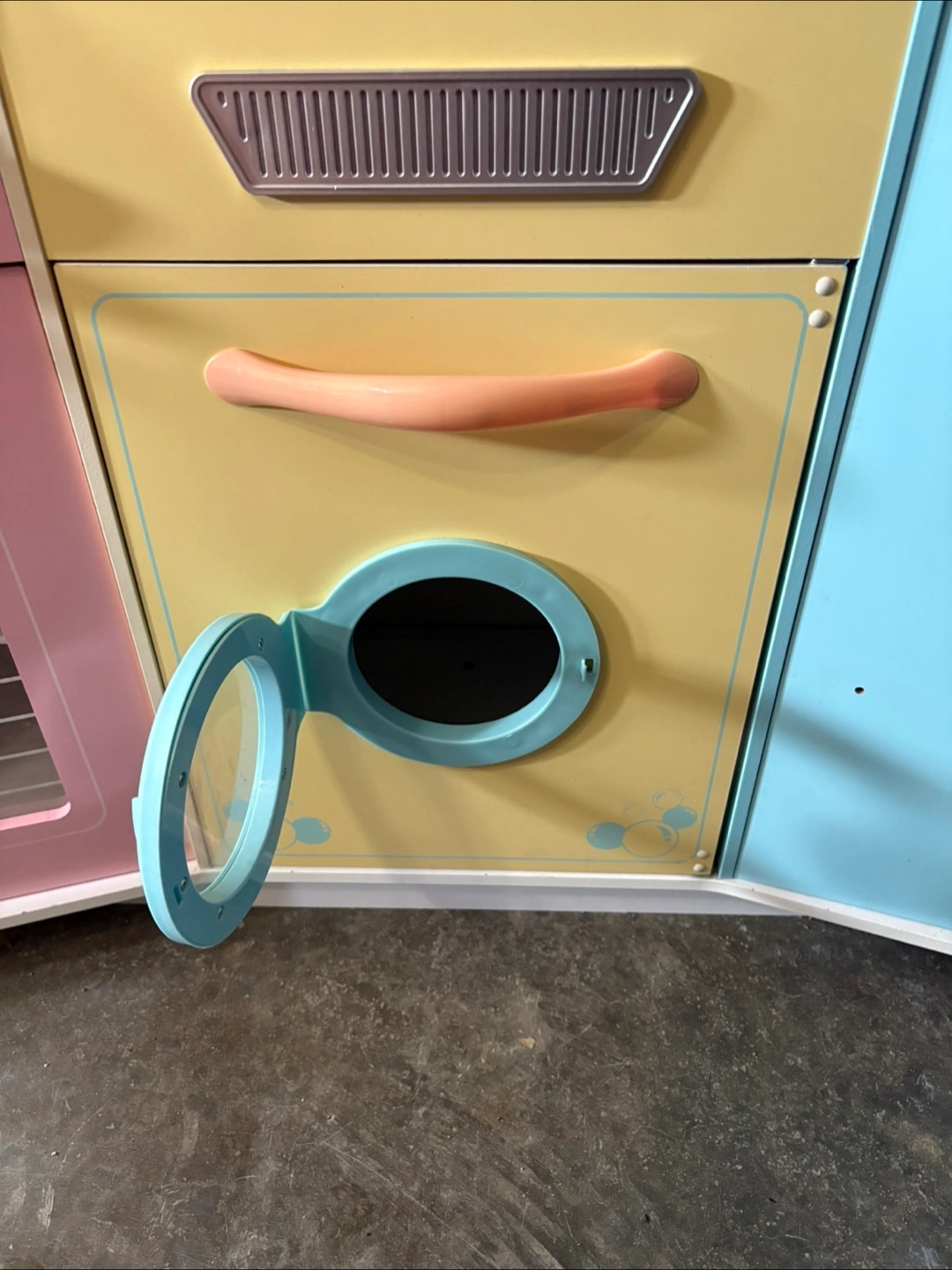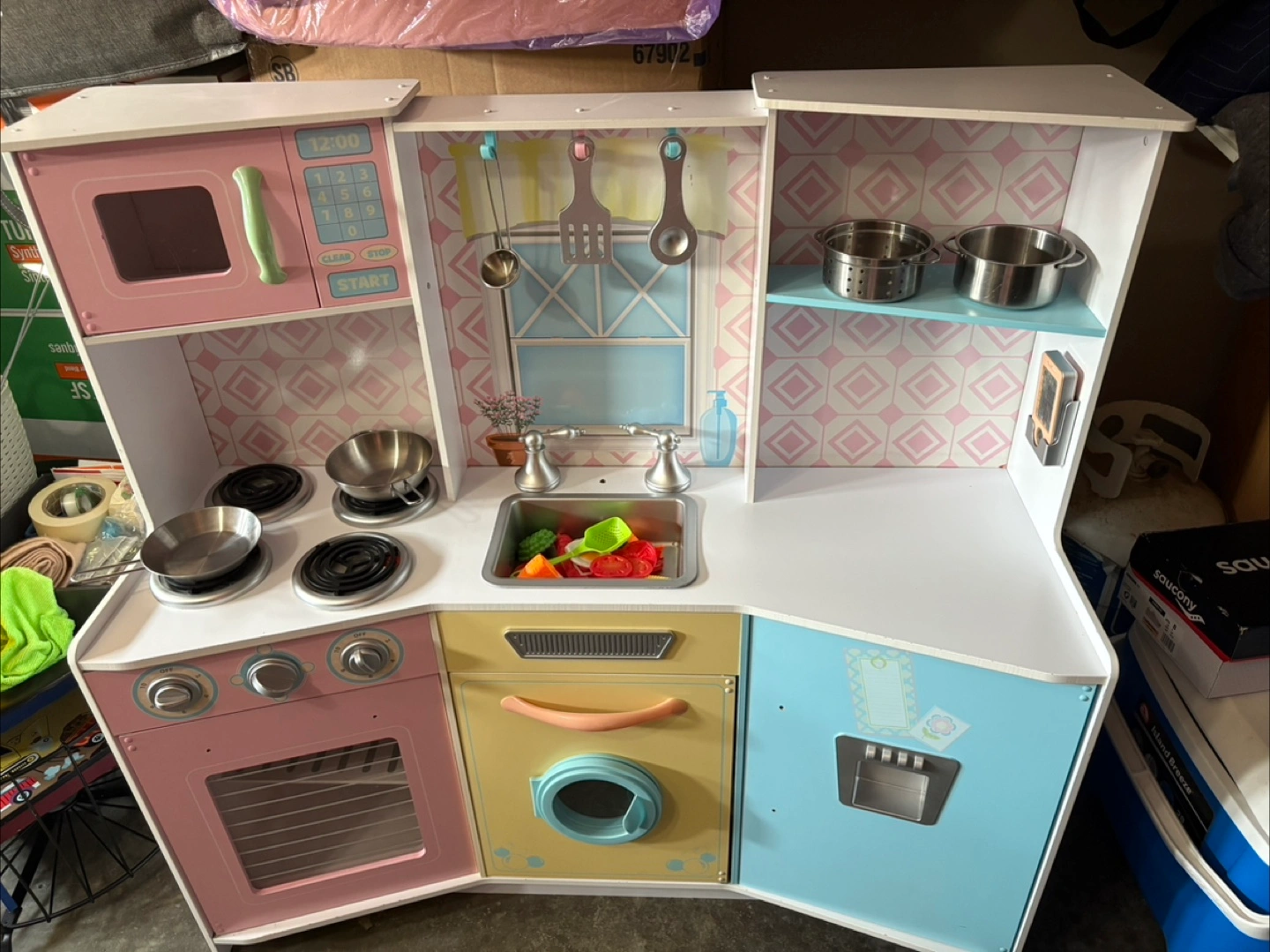 76Refurbished toy play kitchen in good condition - perfect for hours of imaginative play! Includes a microwave, stovetop, oven, washing machine, and a fridge with an ice dispenser. Comes with mini dishes, utensils and an assortment of plastic play food to get started right away! Please note: the faucet and two handles just need to be attached with 1-2 screws (I didn’t get a chance to do it before listing). Easy fix! Cleaned, refreshed and ready for a new home!