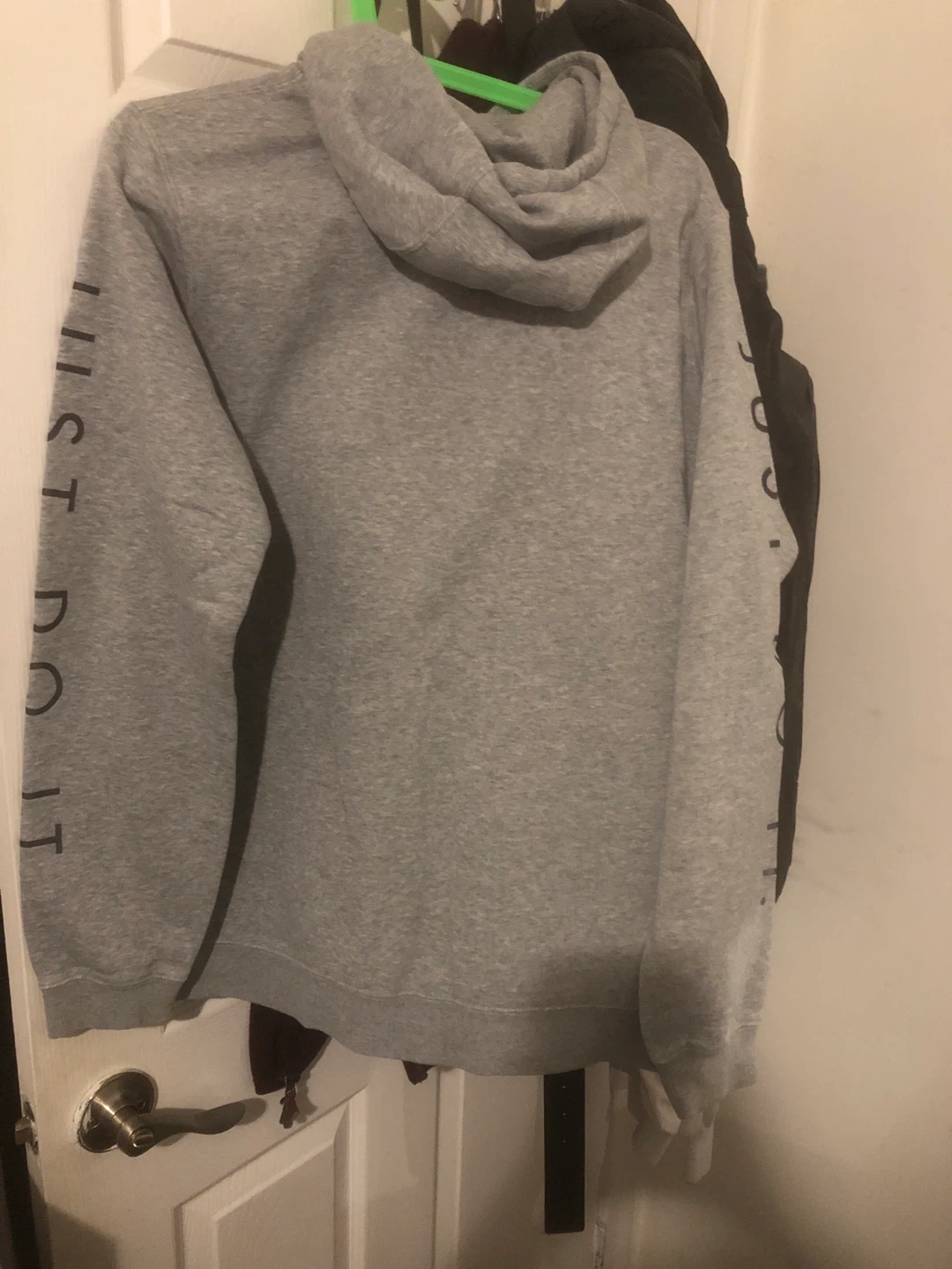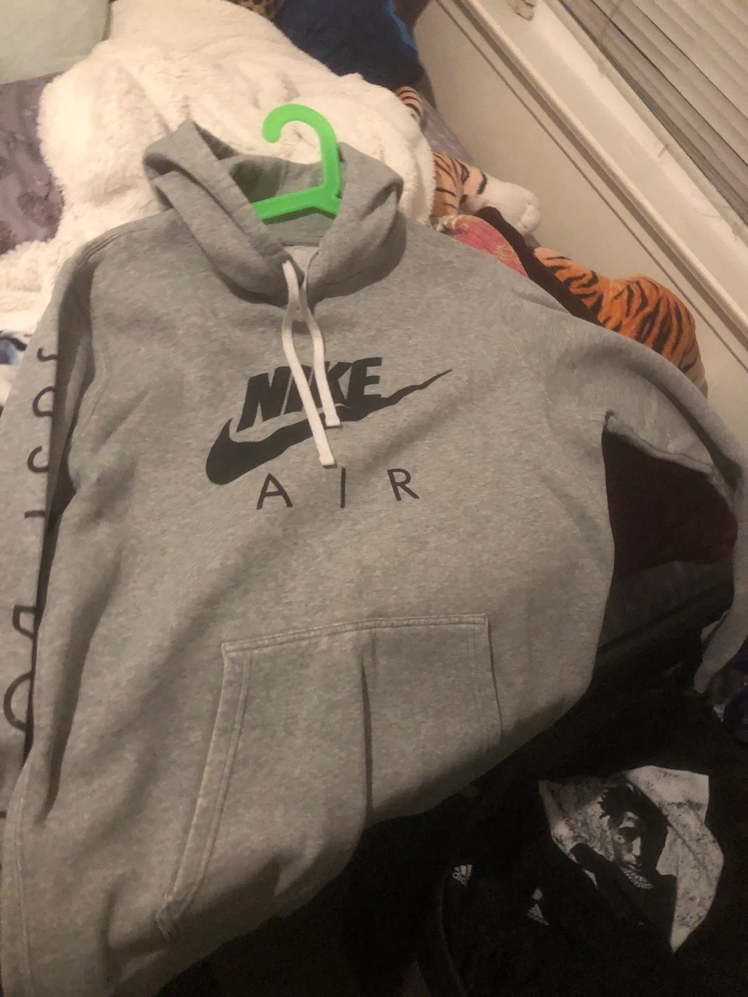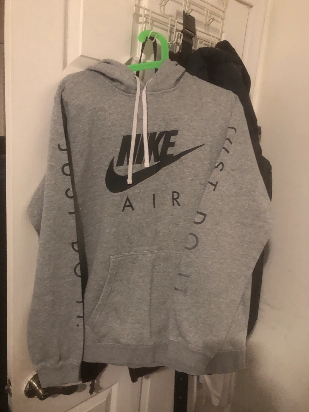 Selling a Nike Air hoodie in grey. It features the Nike logo on the front and 'Just Do It' down the sleeves. Size large, cozy and perfect for everyday wear!