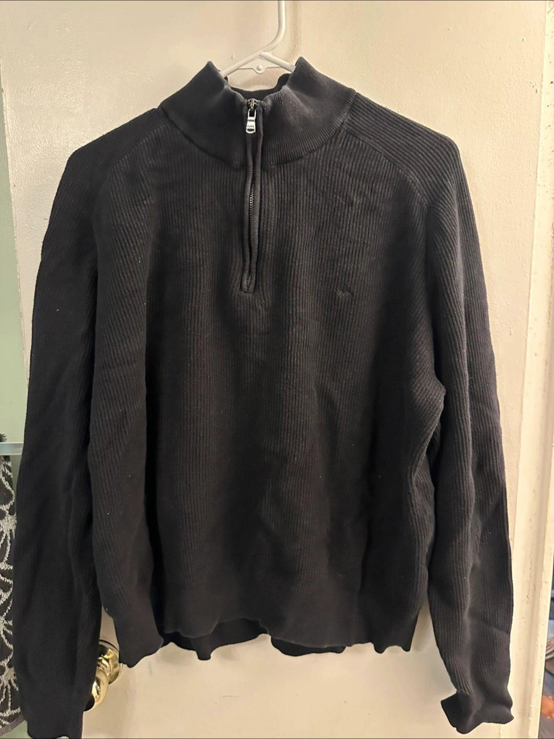 Here's a gently used Michael Kors sweater, perfect for layering! It's a classic black colour and features a 1/4 zip. The size is XL, so it's great for a comfortable fit.