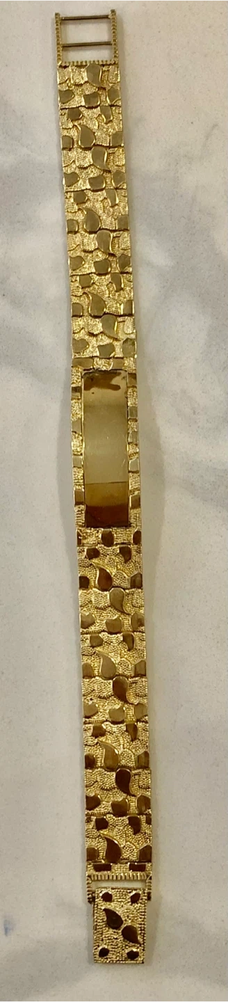 Buy & SellMen's 10k Yellow Gold Nugget ID BraceletMen's 10k Yellow Gold Nugget ID Bracelet$1,710Selling a men's 10k yellow gold nugget ID bracelet. It's 8" in length and 21mm wide. The bracelet weighs 25.11 grams. $3313.00 USAConditionNewSize8”WHERE TO MEETCheck LocationView MapSELLERverifiedMarsGeorgetown1788 reviews1 chats·2 favorites·68 views