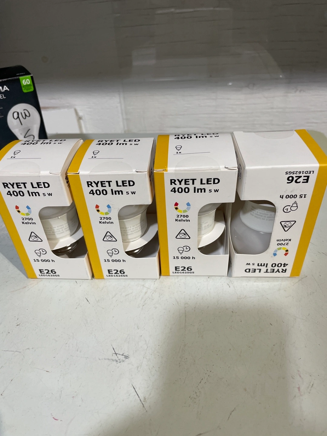I'm selling brand new 4 - RYET LED light bulbs from IKEA. They are 400 lm and 5w. They have a 2700 Kelvin rating and a lifespan of 15,000 hours. These are E26 LED1625G5 bulbs.and 2- Sylvania 9 watts soft white bulbs. (Replacement used )