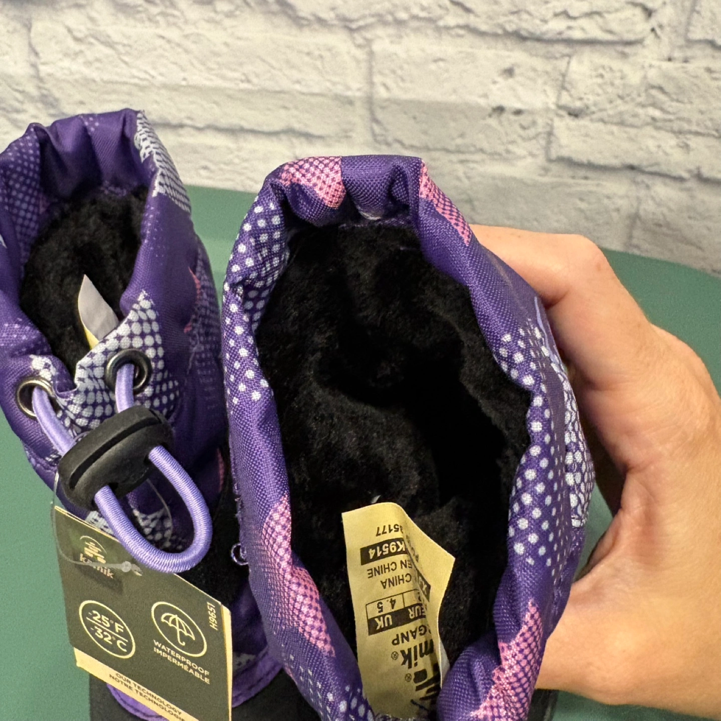 These Kamik snow boots are in new condition and ready for winter adventures! They feature a fun purple pattern with stars and a cozy black lining to keep little feet warm.