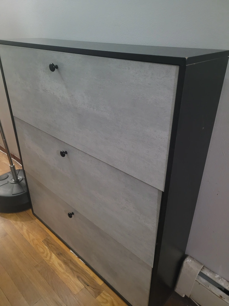 Here's a shoe cabinet in gray and black. It's perfect for keeping your shoes organized and out of the way. It has three tiers and is in great condition!