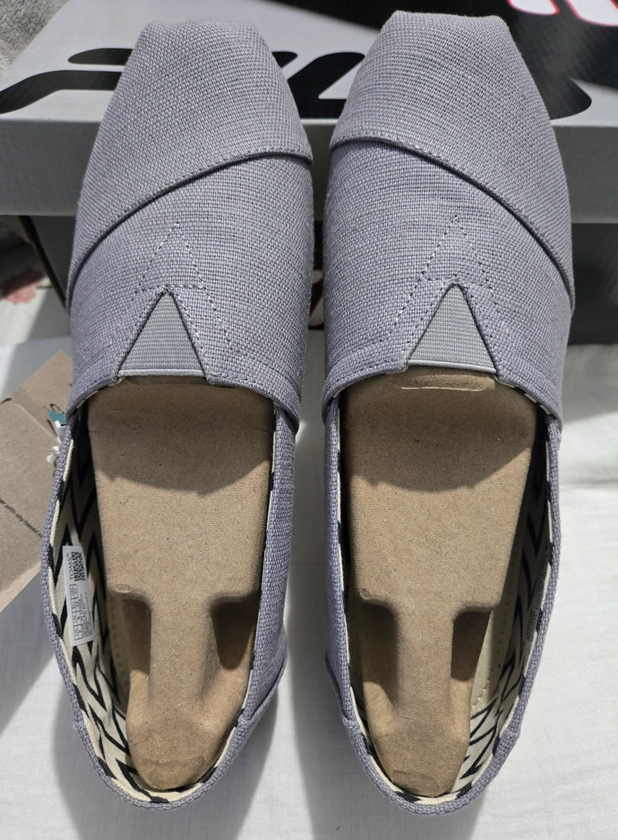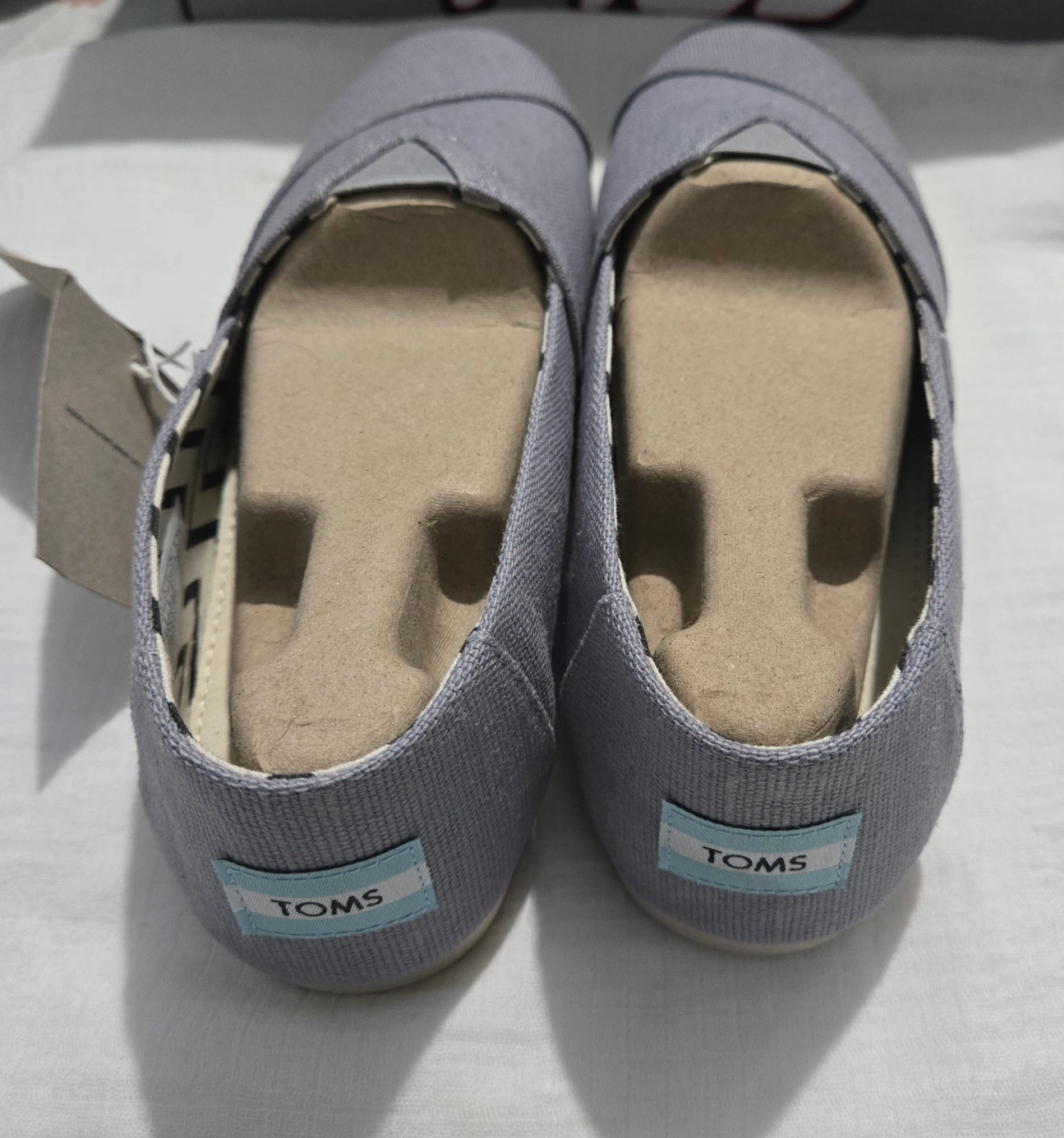 These TOMS slip-on shoes are brand new with tags! They're a stylish grey canvas, perfect for everyday wear. The shoes are size 9