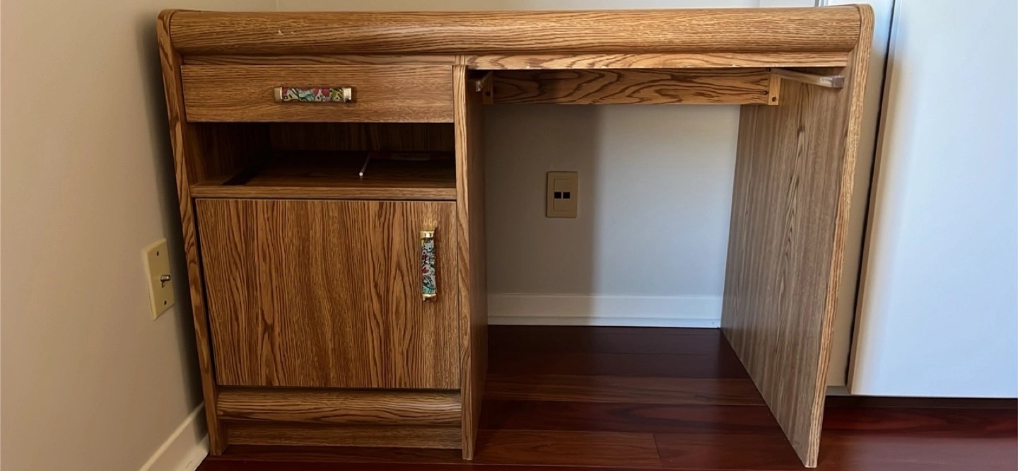 Here's a desk with a wood veneer finish. It features a drawer and a cabinet, perfect for a home office or study space. It's in good condition and ready for a new home!