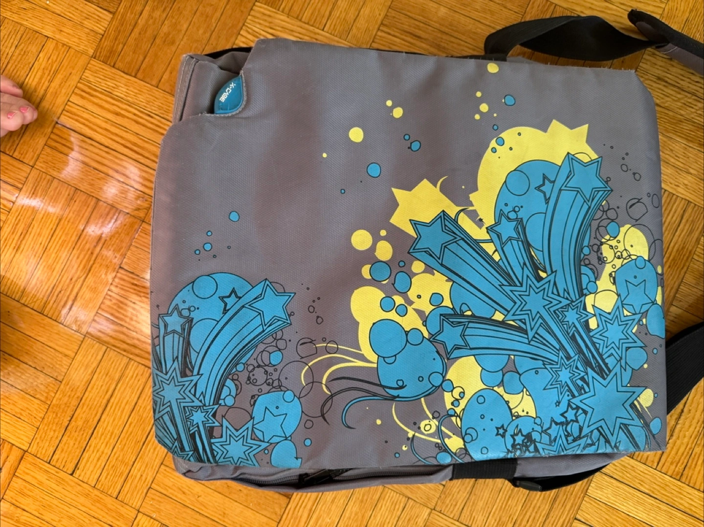 Gently used XCase messenger bag in a neutral grey colour. It features a fun star design in shades of blue and yellow. The bag has multiple compartments inside, perfect for organizing your belongings. It also has an adjustable shoulder strap for comfortable carrying. Great for school or everyday use!