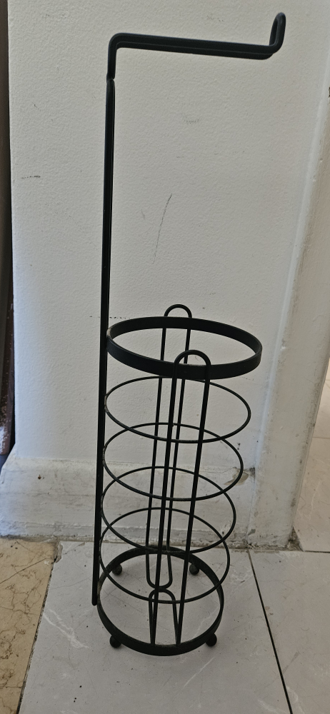 Selling a black metal toilet paper holder stand. It's in great condition and ready to use in your bathroom. It has a sleek, minimalist design that fits well with any decor