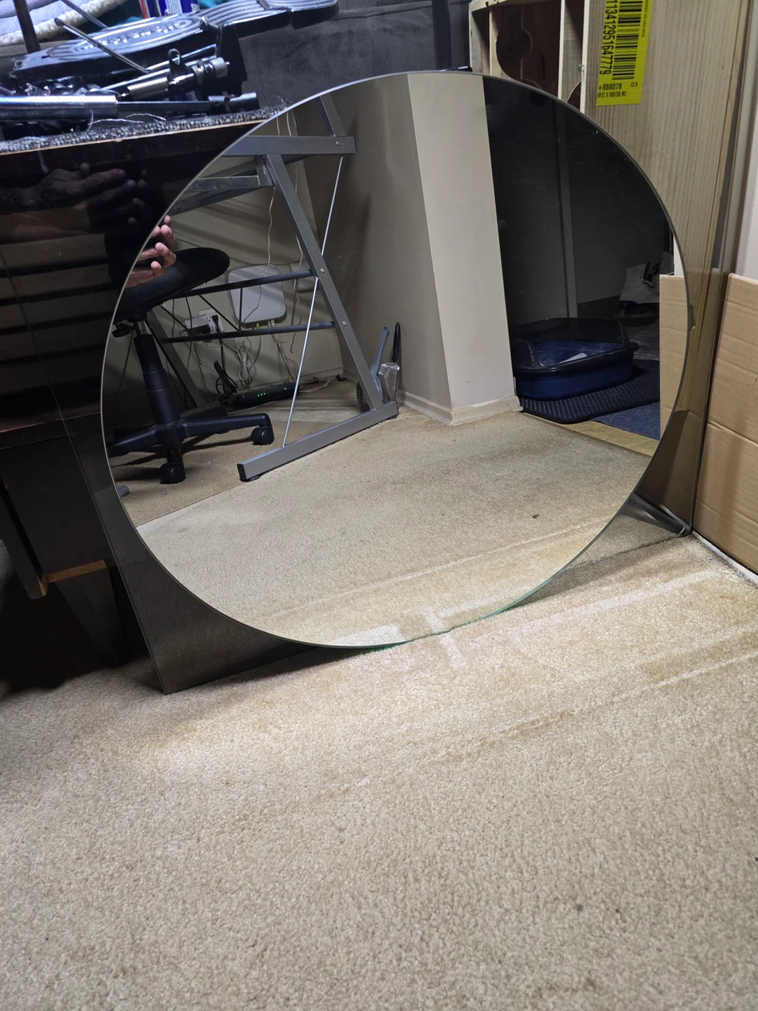 Selling a round frameless wall mirror. It's in great condition and ready to brighten up your space! The mirror has a sleek, modern design that would fit well in any room