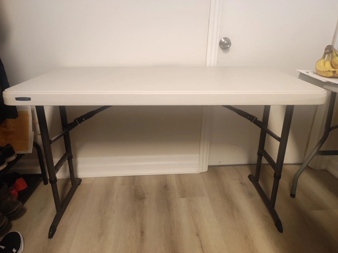 Selling a Lifetime folding table! It's in great shape and perfect for extra workspace or gatherings. Easy to fold and store when not in use. The table is white with a dark gray frame.