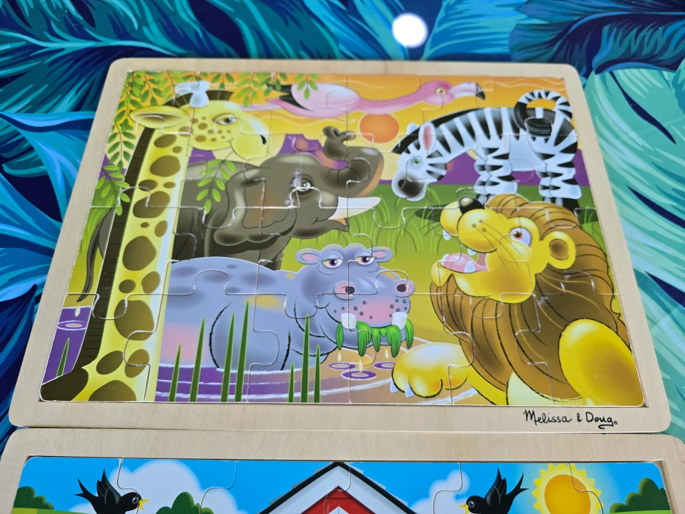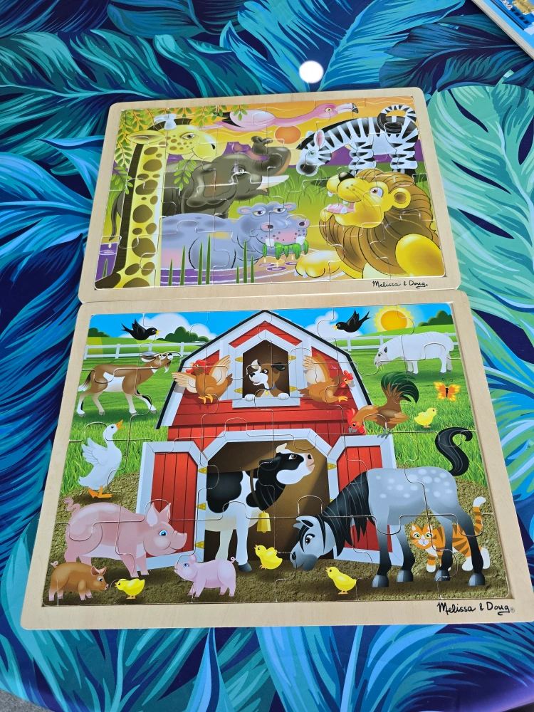 1762 Puzzle Boards Pick up in North York Keele St and Wilson Ave area Gently used ▶️ Multi Family Account / Cash only AI: Two Melissa & Doug wooden jigsaw puzzles in great condition! One is a barnyard scene and the other is a safari animal scene