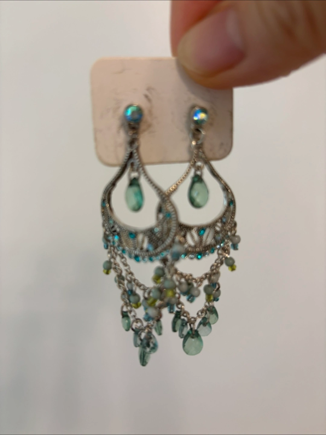 These are a pair of dangling earrings with a silver-tone finish and delicate blue accents. They feature a tiered design with small, teardrop-shaped pendants and intricate detailing. Perfect for adding a touch of elegance to any outfit!