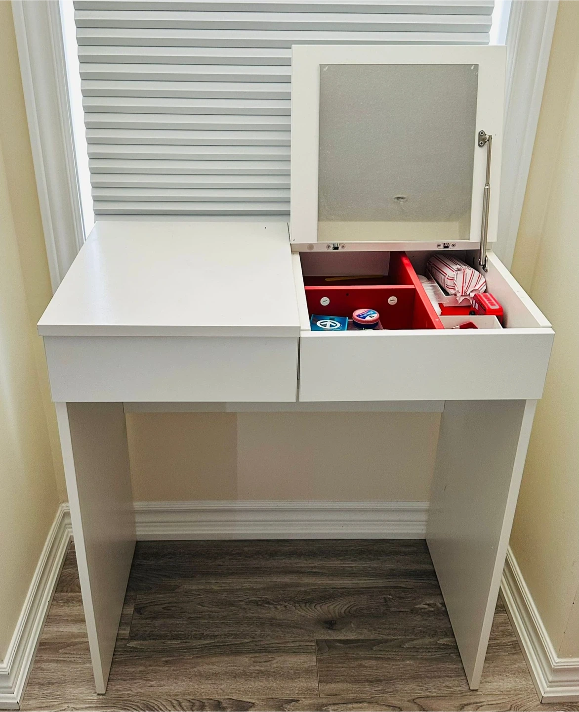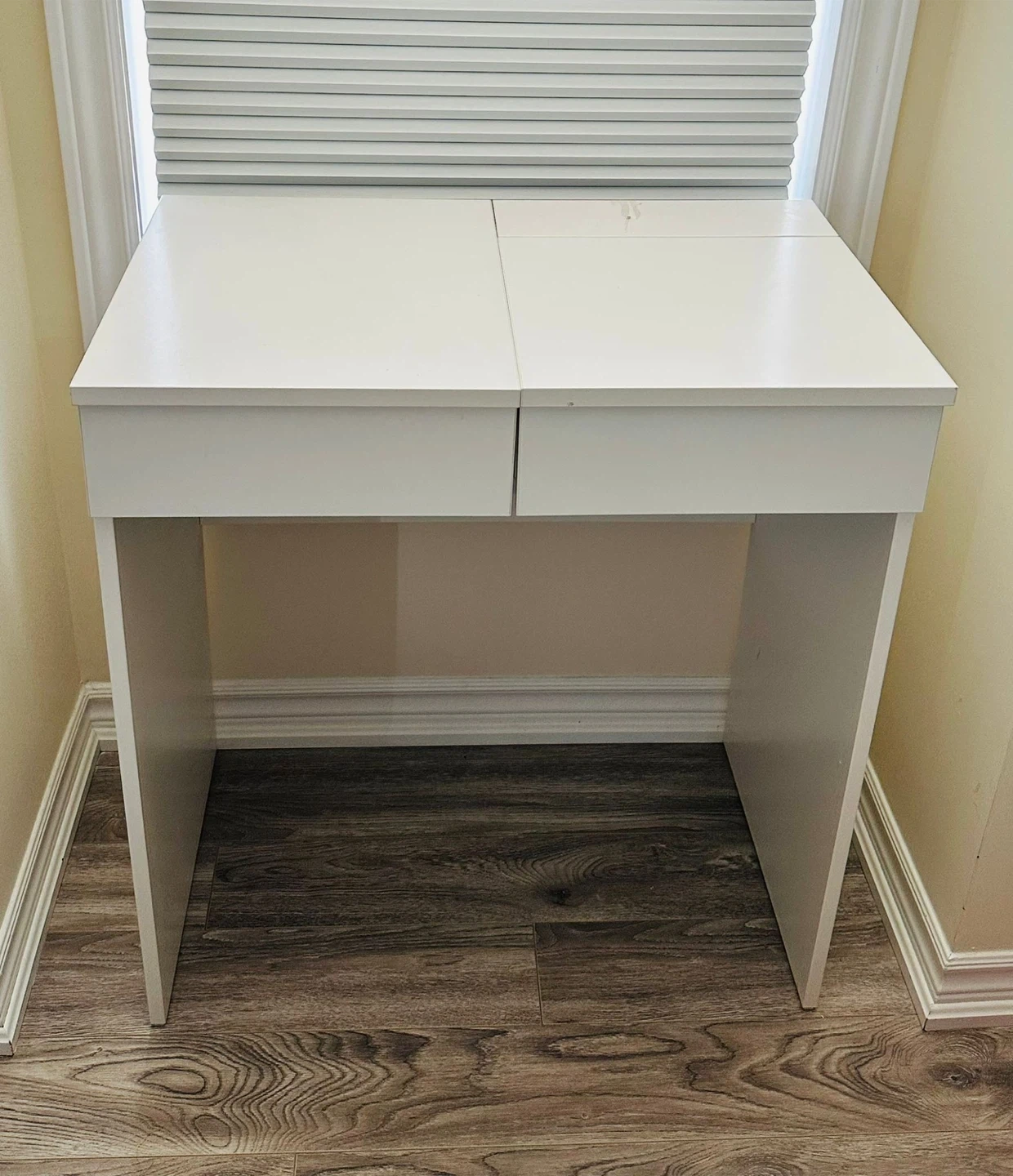 Selling a cute white vanity makeup table! It's perfect for small spaces and has a built-in mirror. The table is in great condition and ready for a new home. It has drawers for storage and a lift-top section with a mirror and more storage! A great addition to any bedroom or dressing area