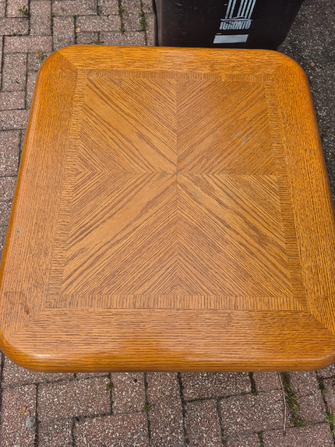 A lovely oak wood side table, perfect for any room in your home! It features a unique design on the top and a convenient shelf underneath. The colour is a warm, natural oak.Great for living room, bedroom. or cottage. Beautiful heavy wood. Measurements are 22 inches wide and tall. Asking 25 dollars or best offer. Located in Scarborough just east of Morningside and Lawrence ave. Etransfer available. Cross posted in other groups.