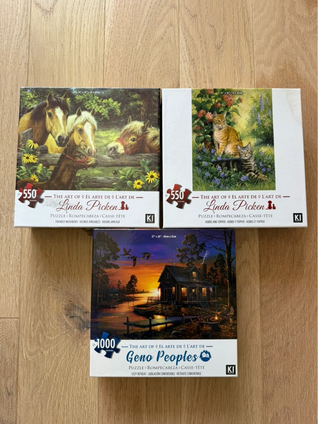 Selling a collection of puzzles featuring art by Linda Picken and Geno Peoples.