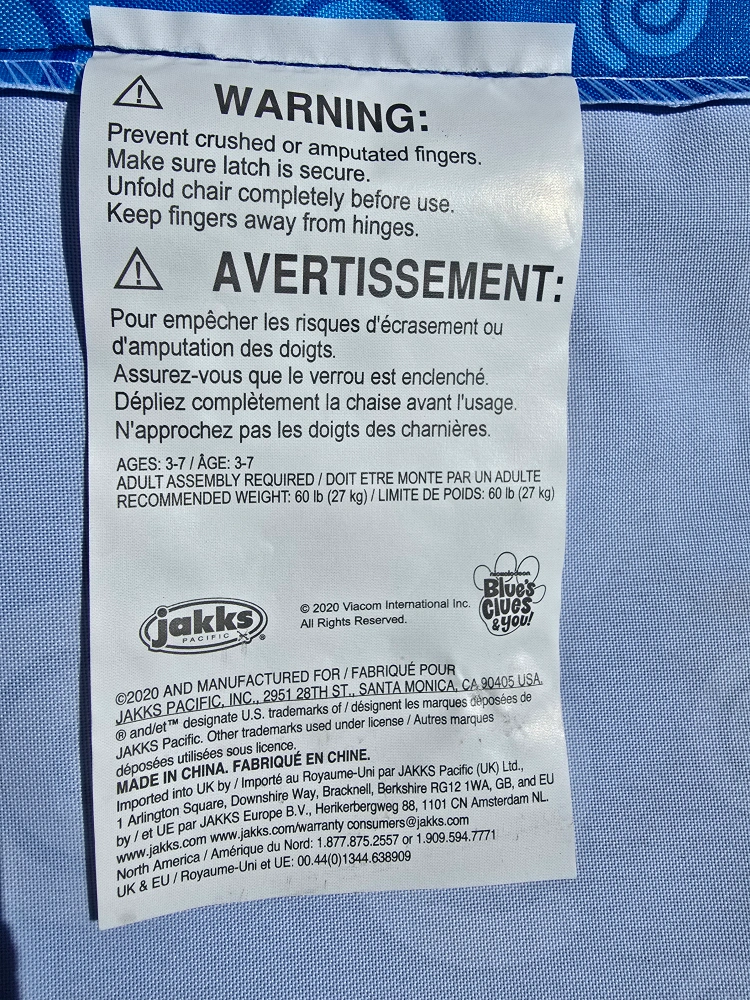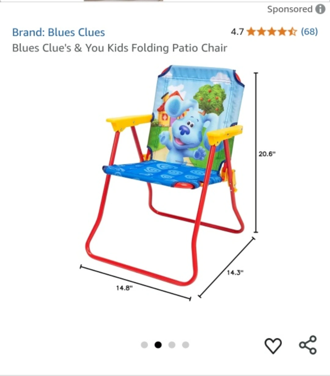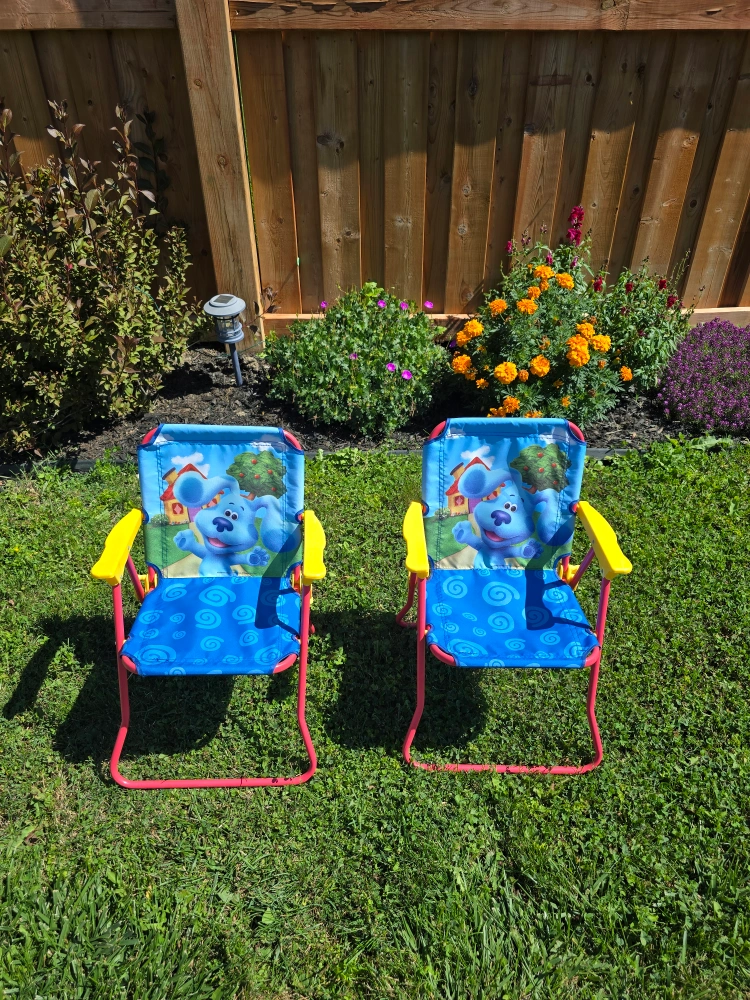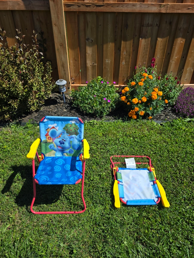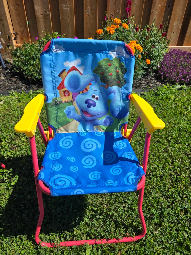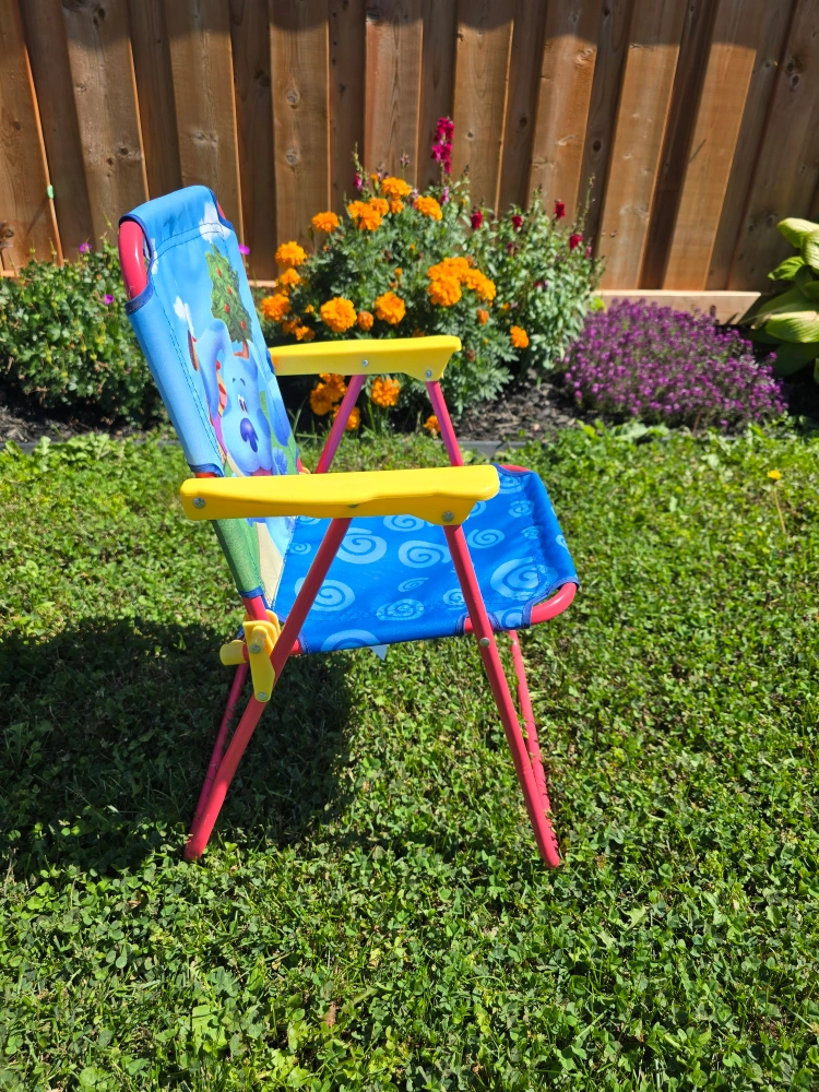 176Pick up in North York Keele St and Wilson Ave area Gently used; in great condition ▶️ Multi Family Account / Cash only AI: Here's a super cute Blue's Clues camp chair for your little one! It's in great shape and ready for some outdoor fun. - Recommended for ages 3-7 - Adult assembly required - Recommended weight limit is 60 lb (27 kg)