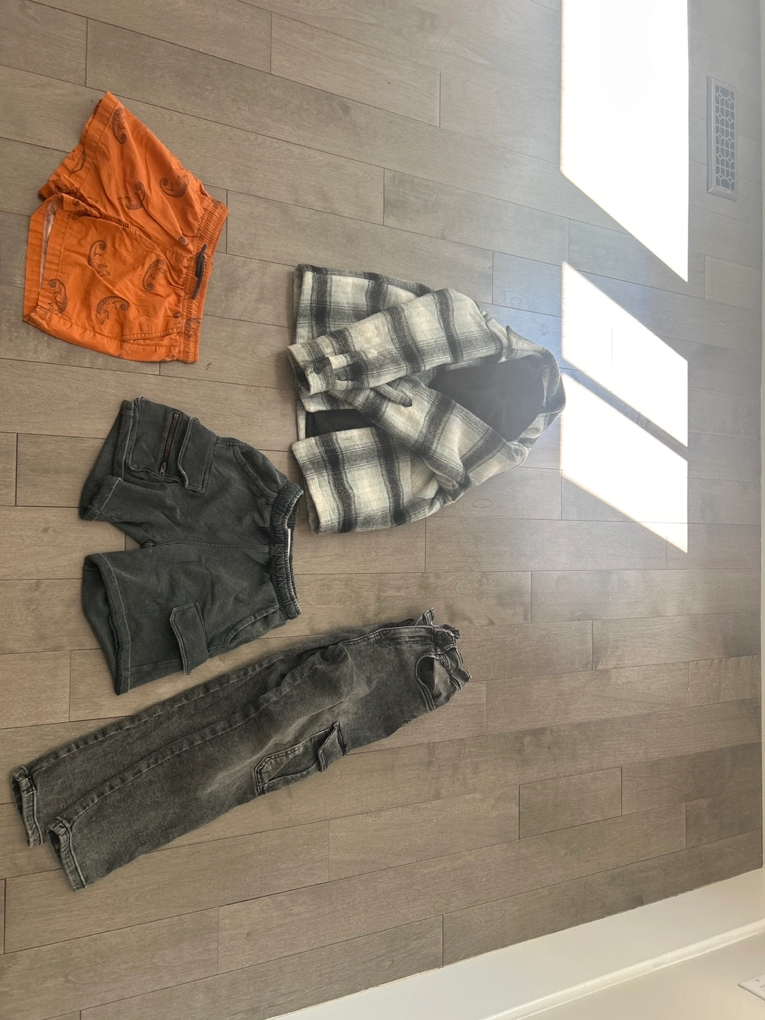 Selling a bundle of kids' clothing! Includes a pair of orange patterned swim shorts, a black and white plaid shirt jacket , a pair of dark grey cargo shorts, and a pair of dark grey cargo pants. All Size 8-9 boys Zara hardly worn