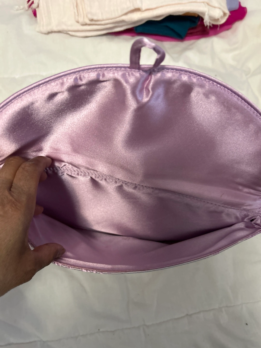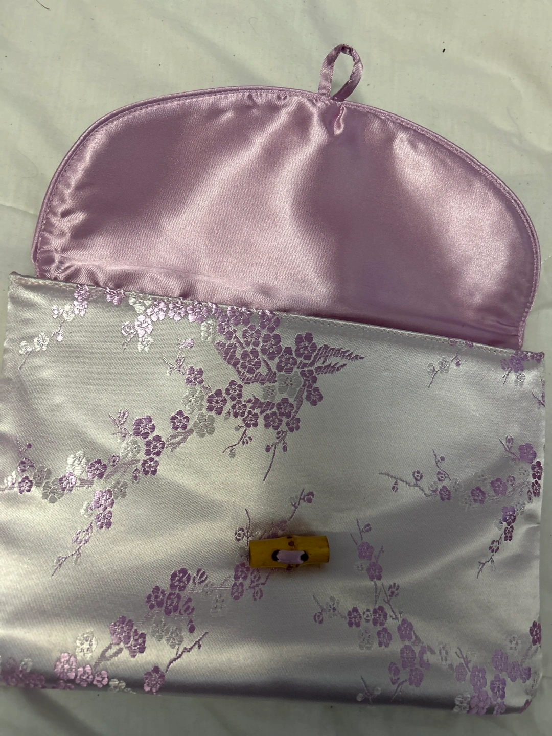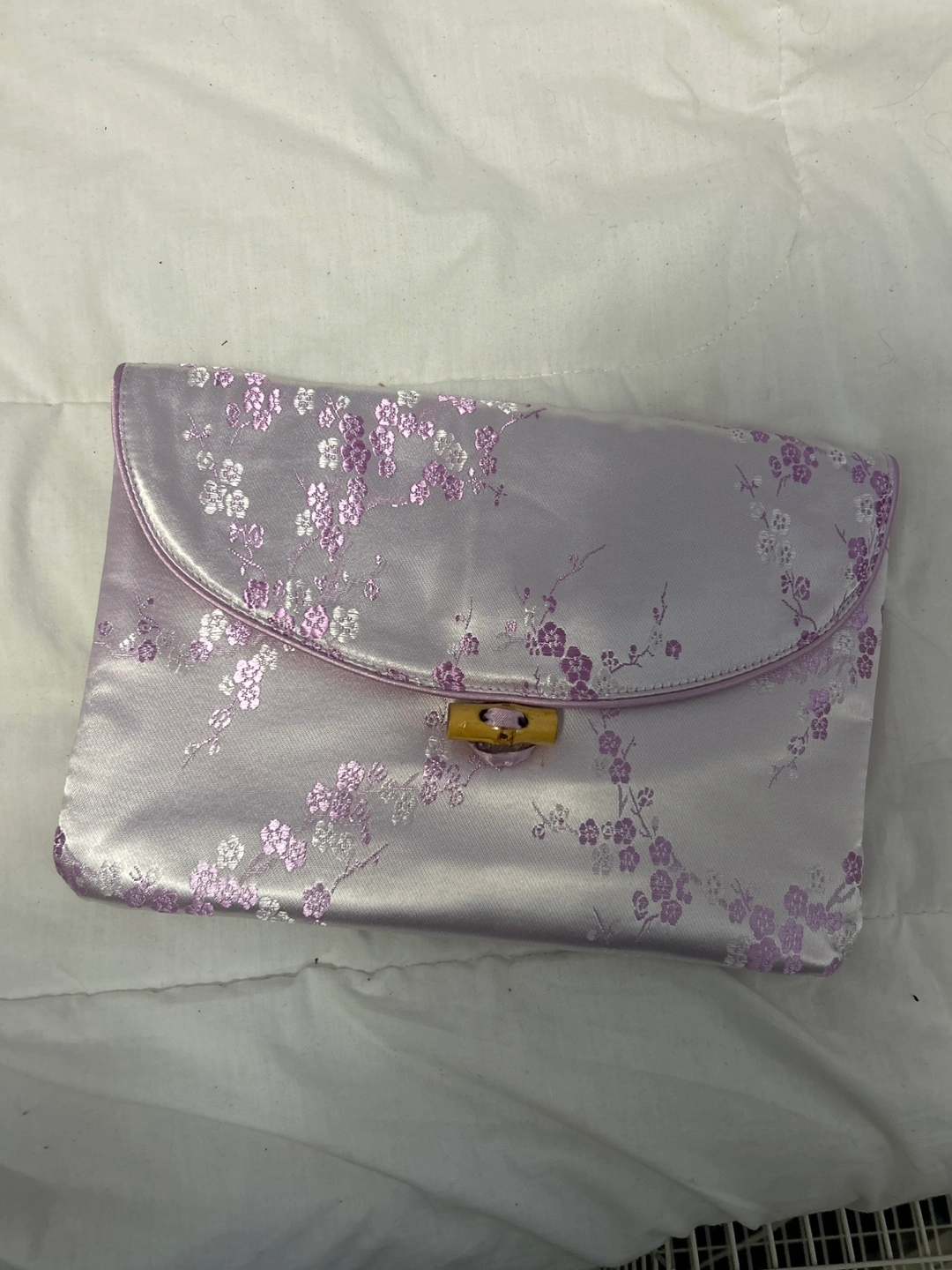 Brand new. Selling a cute lilac clutch purse with a floral pattern! It has a bamboo-style closure and a satin-like interior. Perfect for a night out or special occasion