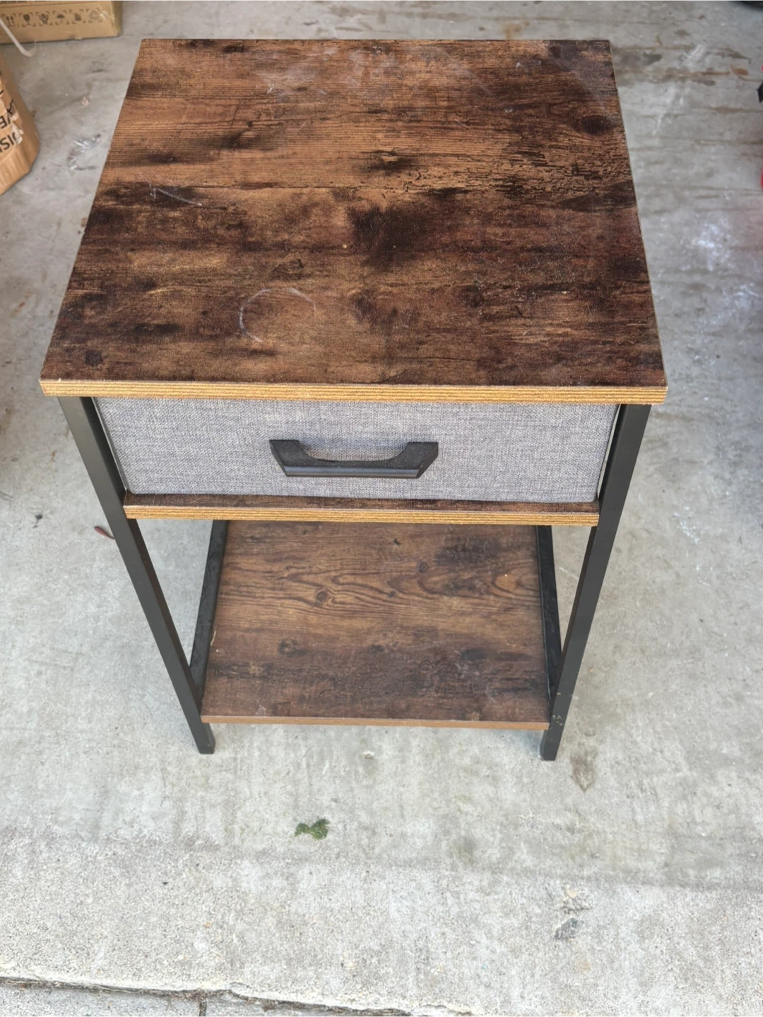This is a side table with a drawer and a shelf. It has a rustic wood look with a gray fabric drawer. Perfect for a bedside table or small accent table