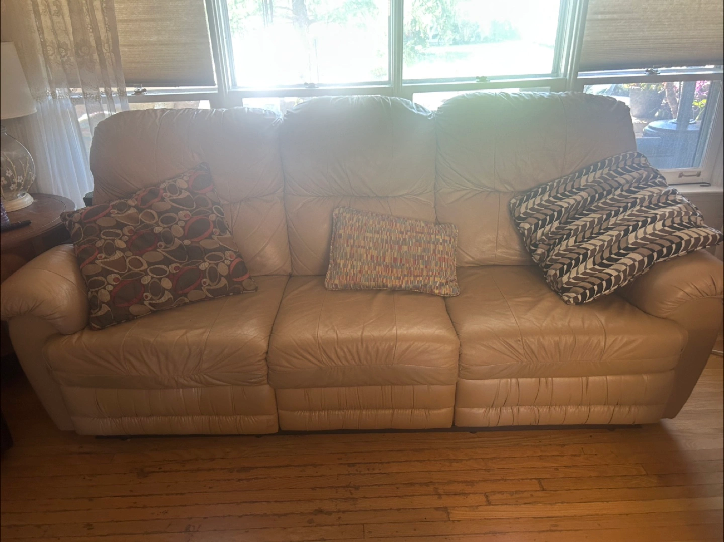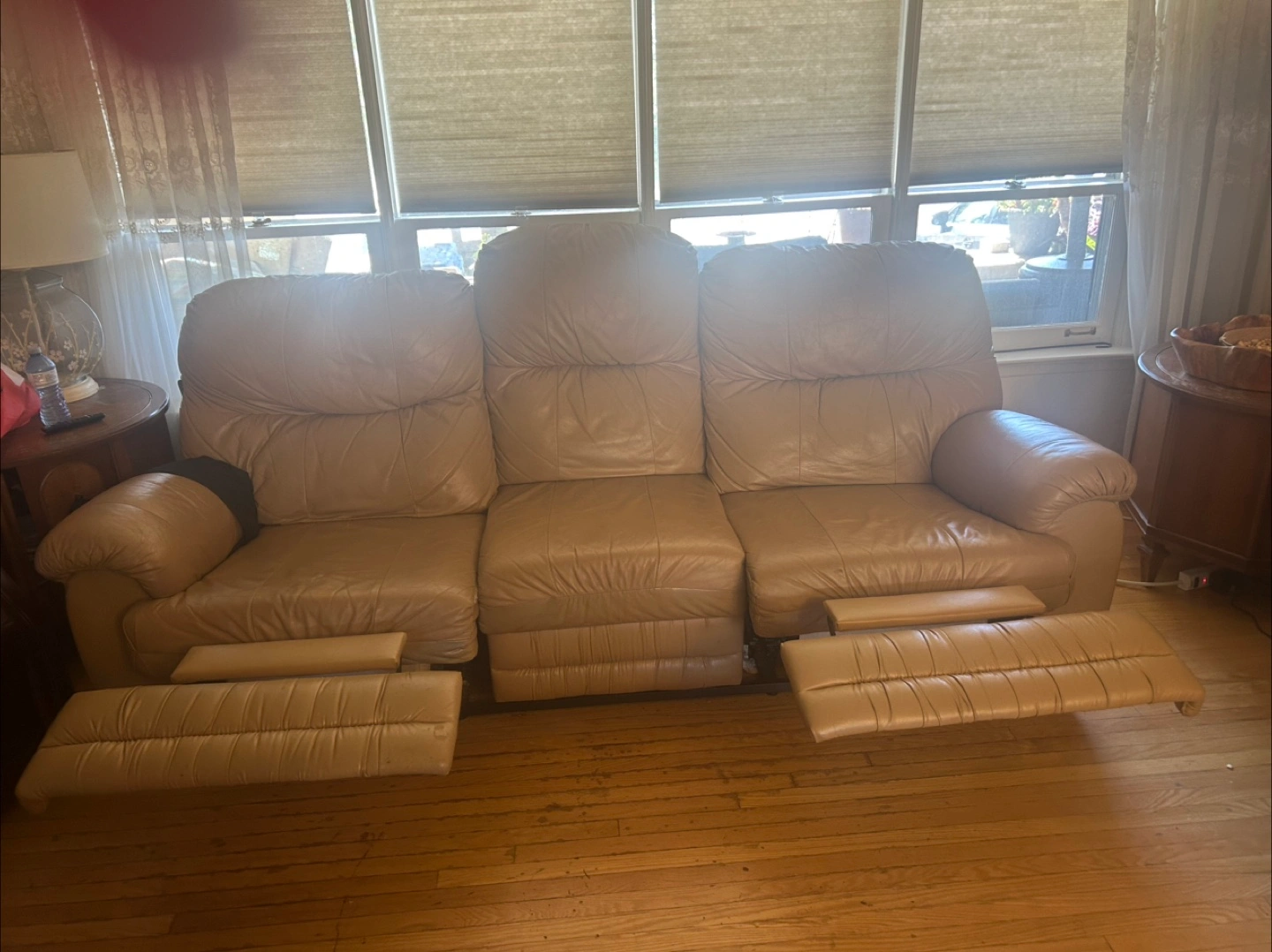 Selling a comfy beige leather three-seat recliner sofa! It's perfect for relaxing and watching movies. The recliner function works great on both end seats. It has some signs of wear, but it's still in good condition for its age