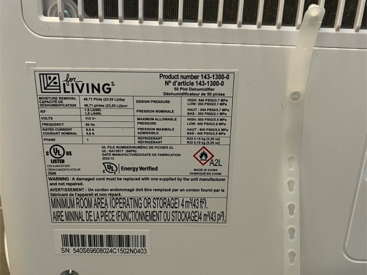 138"For Living" 50 Pint White Portable Dehumidifier. Perfect for up to 3000-4000 square feet. Powerful and collects humidity quickly. Purchased at Canadian Tire in June and used twice, a total of 4-5 hours. Castor Wheels are removable. Original box and manual included. Extremely clean and as you can see from filter, like new! Purchased for $339 (before tax), now on sale $260. Canadian Tire Link attached below. Asking $125. Please message on app or text 416-833-1623. Thanks :) https://www.canadiantire.ca/en/pdp/for-living-50-pint-white-portable-dehumidifier-white-1431300p.html