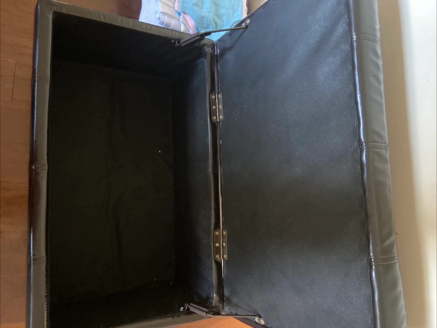 Dark brown storage ottoman! It's great for storing blankets, toys, or anything else you need to keep out of sight. The top lifts up easily, and the inside is quite spacious. It has some wear and tear in one corner but other than that ys in great condition very functional and sturdy and clean.