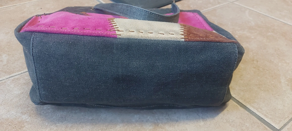 This is a cute denim tote bag! It features a unique patchwork flower design in pink, beige, and brown suede. It's perfect for carrying your everyday essentials. The bag is in good condition and ready for a new home