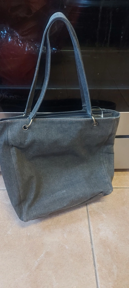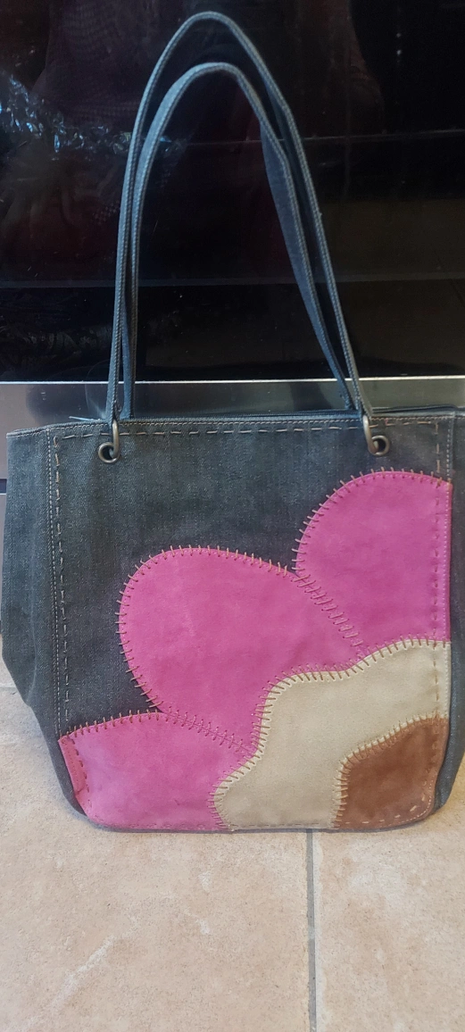 This is a cute denim tote bag! It features a unique patchwork flower design in pink, beige, and brown suede. It's perfect for carrying your everyday essentials. The bag is in good condition and ready for a new home