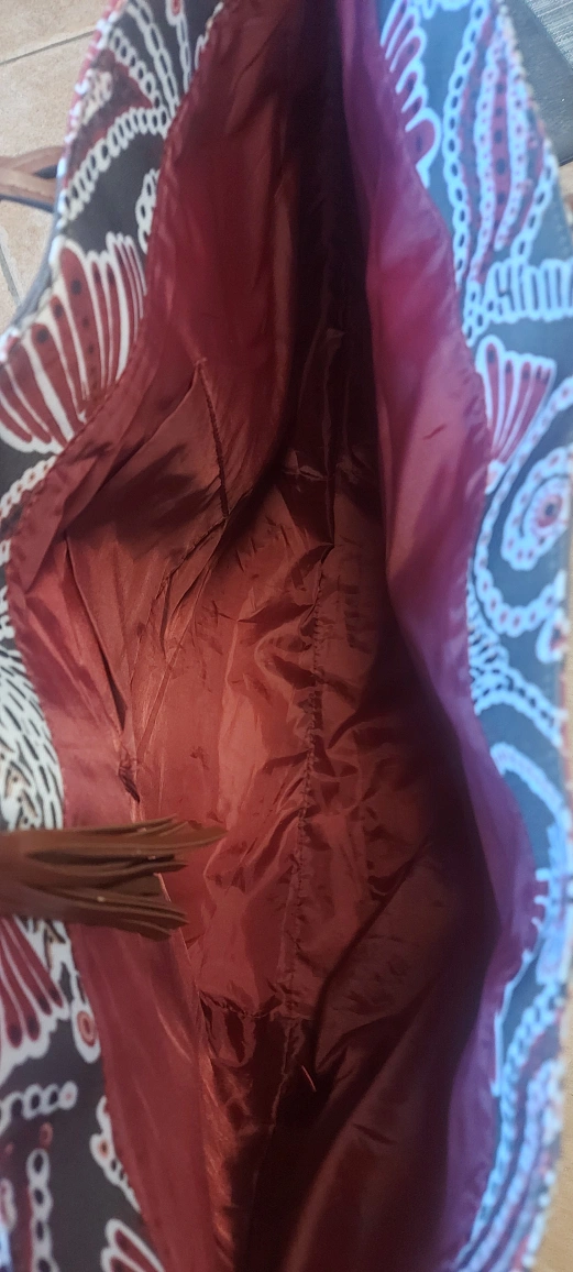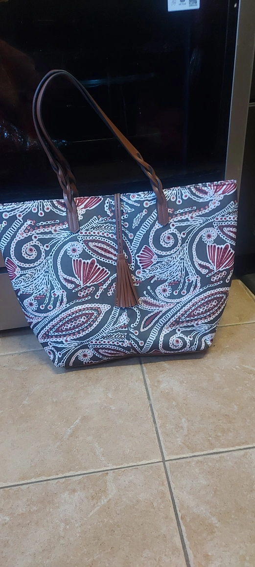 Here's a stylish tote bag featuring a unique paisley pattern! It has brown leather-look accents and braided straps. The interior is lined with a burgundy fabric. Perfect for carrying your daily essentials!
