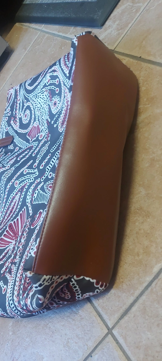 Here's a stylish tote bag featuring a unique paisley pattern! It has brown leather-look accents and braided straps. The interior is lined with a burgundy fabric. Perfect for carrying your daily essentials!