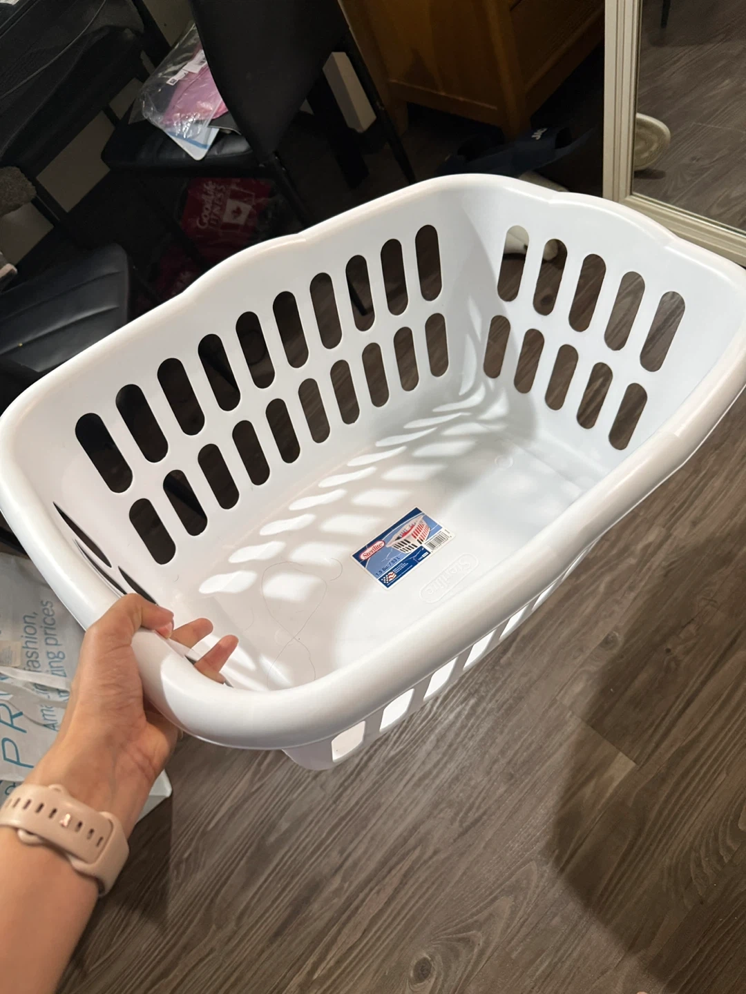 This is a white plastic laundry basket. It's made of durable plastic and features cut-out handles for easy carrying. It's a great size for holding laundry loads.