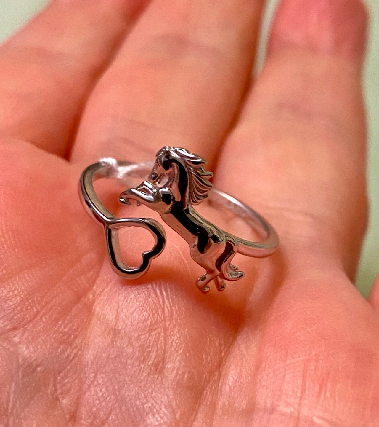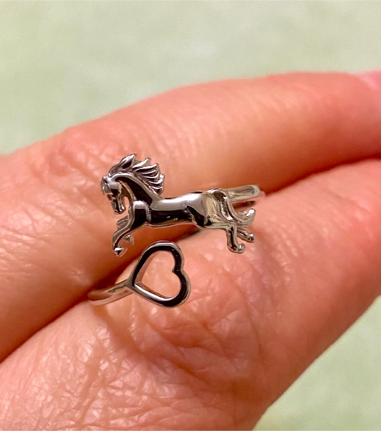 This adjustable sterling silver ring features a detailed horse design intertwined with a heart. It's made of S925 sterling silver. This piece is perfect for equestrian enthusiasts or anyone who loves unique animal-themed jewelry!