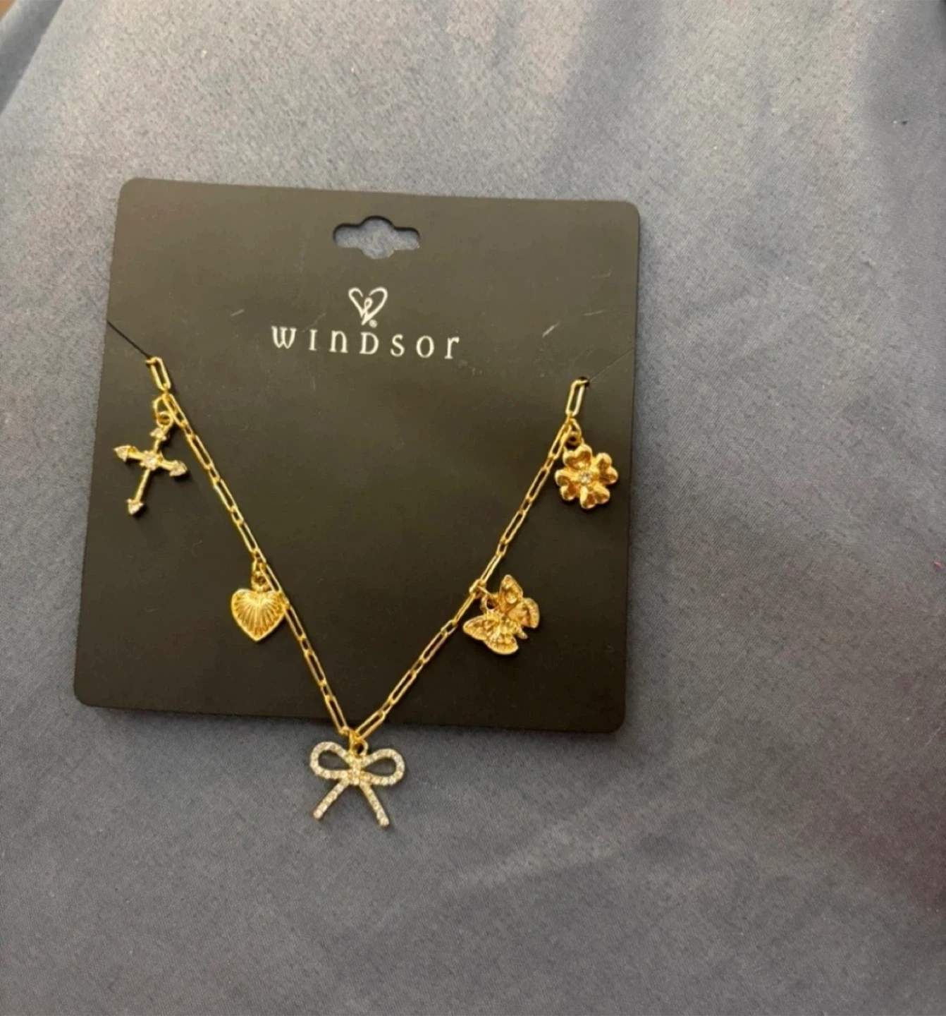 A gold-toned necklace from Windsor featuring a variety of charms including a cross, heart, butterfly, flower, and bow. It has a lobster clasp closure. This necklace adds a delicate touch to any outfit!