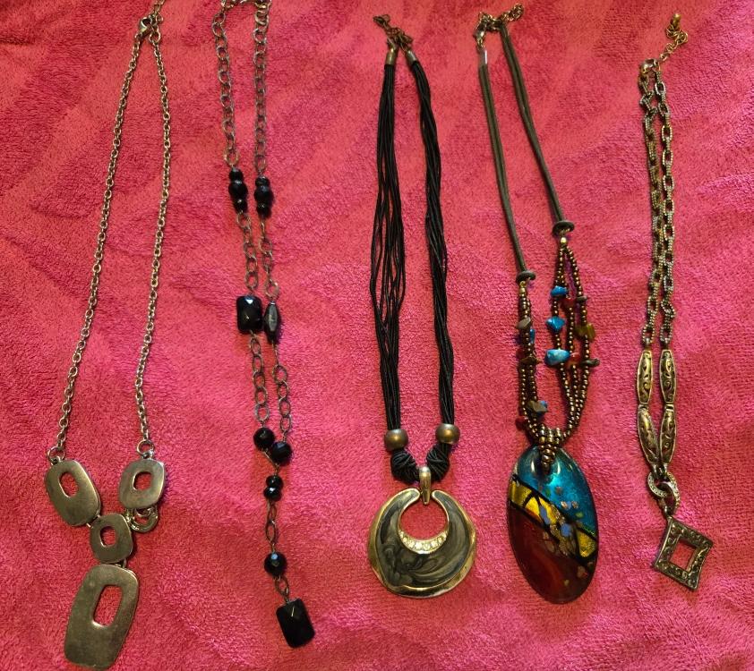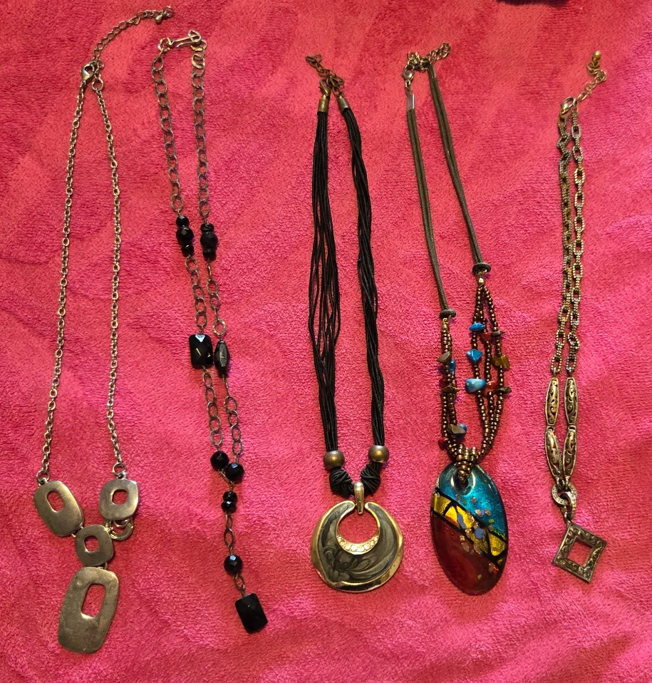 Selling a set of five unique fashion necklaces. Each necklace has its own distinct style and charm, perfect for adding variety to your accessory collection. They are in good condition and ready to be enjoyed!pick up NECH